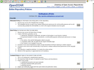 В документе представлена презентация Ирины Кучмы о подготовке и создании архивов открытого доступа, представленная на совместном семинаре 11 июня 2009 года. Обсуждаются ключевые аспекты, такие как создание институционального репозитория, его цели, содержание, а также необходимые ресурсы и стратегии для успешного управления и продвижения репозиториев. Документ также включает рекомендации по политике открытого доступа и что архивировать, подчеркивая необходимость соблюдения интеллектуальной собственности и эффективного маркетинга.