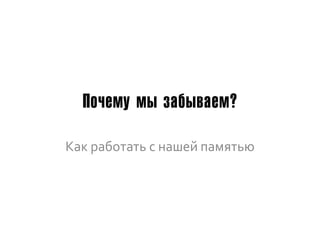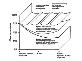 Документ обсуждает механизмы памяти и забывания, а также факторы, влияющие на запоминание информации. Основное внимание уделяется различиям между кратковременной и долговременной памятью и стратегиями повышения эффективности запоминания. Упоминается важность повторения и необычности для улучшения запоминаемости.