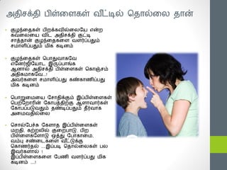 சதால்த தான் ீ • குமந்ததகள் ிக்கயில்தயன என் கயததன யிட அதிசக்தி குட்டி சாத்தான் குமந்ததகத யர்ப்தும் சநாிப்தும் நிக கடிம் • குமந்ததகள் சாதுயாகயய எயர்ஜியனாட இருப்ாங்க ஆால் அதிசக்தி ிள்தகள் சகாஞ்சம் அதிகநாகயய...! அயர்கத சநாிப்து கண்காணிப்து நிக கடிம் • சாறுதநதன யசாதிக்கும் இப்ிள்தகள் சற்யாரின் யகாத்திற்கு ஆாயார்கள் யகாப்டுயதும் தண்டிப்தும் தீர்யாக அதநயதில்த • சசால்யச்சு யகாத இப்ிள்தகள் நதி, கற்ில் குதாடு, ி ிள்தகயாடு ஒத்து யாகாதந, யம்பு சண்தடகத யட்டுக்கு ீ சகாணர்தல் ....இப்டி சதால்தகள் இயர்கால் ! இப்ிள்தகத யணி யர்ப்து நிக கடிம் ....!