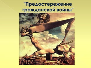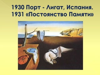 Документ рассказывает о жизни и творчестве Сальвадора Дали, начиная с его рождения 11 мая 1904 года и заканчивая эмиграцией в Америку в 1940 году. В нем описаны ключевые события, такие как первые выставки, обучение и важные встречи с известными художниками, а также взаимодействие с сюрреализмом. Дали рос в условиях, способствующих его развитию как гениального художника, несмотря на преграды в образовании.