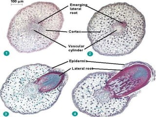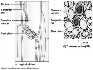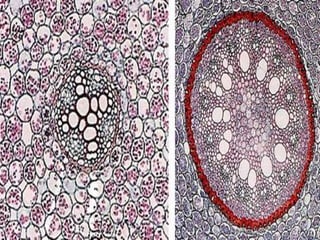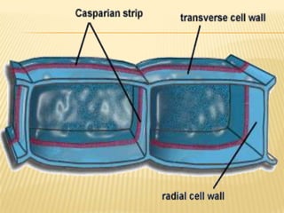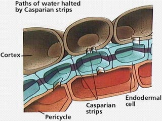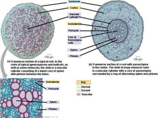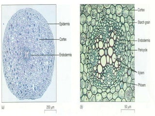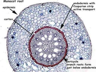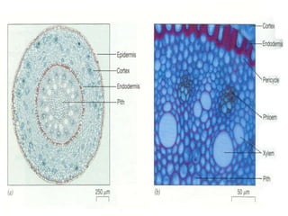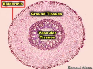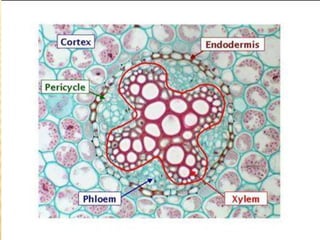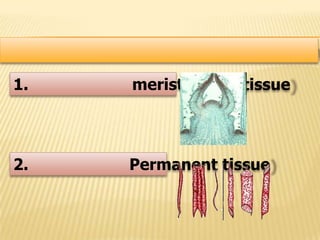 The document summarizes the different types of plant tissues. It describes 1) meristematic tissue which allows for growth and includes the apical, intercalary, and lateral meristems. 2) Permanent tissue which does not grow including simple tissues like epidermis, parenchyma, collenchyma, and sclerenchyma, and complex tissues like xylem and phloem which transport water and nutrients. The vascular bundle contains the xylem, phloem, and pericycle surrounded by the cortex with the epidermis and casparian strip on the outside.