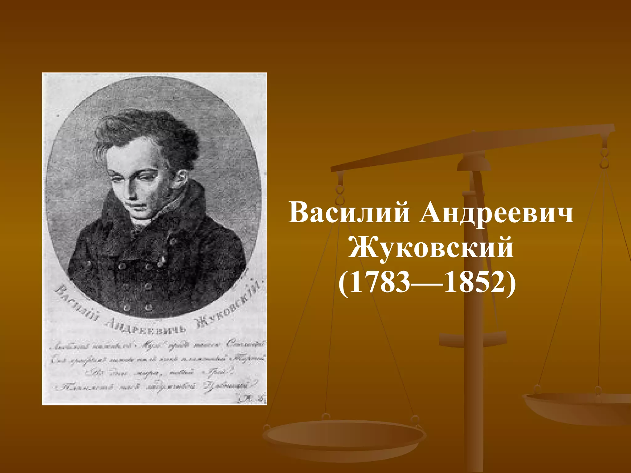 Василий Андреевич Жуковский (1783—1852) был поэтом, родившимся в Тульской губернии как незаконнорожденный сын помещика. Он получил образование в благородном пансионе и стал известен благодаря своим стихотворениям, включая первый официальный гимн России. Жуковский умер в 1852 году и был похоронен в Санкт-Петербурге.