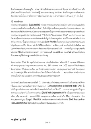 • การพัฒนาของโครงสรางพื้นฐานดานโทรคมนาคมของโลกและการเพิ่มขึ้นของการเคลื่อนยายของขอมูล ขามพรมแดน การใหเทคโนโลยี เชน อินเตอรเนท ดาวเทียมสื่อสาร และโทรศัพท 2.4 ดานกฎหมาย • การเพิ่มขึ้นของจํานวนมาตรฐานตางๆ ที่ถูกนําไปใชทั่วโลก เชน กฎหมายสิขสิทธิ์ และสิทธิบัตร • การผลักดันโดยผูสนับสนุนตางๆเพื่อการจัดตั้งศาลอาชญากรรมระหวางประเทศและการเลื่อนไหวเพื่อ ความยุติธรรมระหวางประเทศ • บางทานก็ไดใหความคิดเห็นวาแมแตการกอการรายก็ไดเปลี่ยนแปลงตามโลกาภิวัตนโดยการโจมตี ประเทศตางๆ ที่ไมไดกอใหเกิดความสัมพันธโดยตรงกับประเทศของตนเอง 2.5 ผลของการเจรจาการคาระหวางประเทศ อุปสรรคตางๆ ตอการคาระหวางประเทศไดคอยๆลดลง ตั้งแตสงครามโลกครั้งที่ 2 โดยขอตกลงระหวาง ประเทศตางๆ ไดแก GATT ผลของการดําเนินงานภายใต GATT และ WTO ประกอบดวย • การสงเสริมการคาเสรี Ø ของสินคา v การลดหรือการขจัดภาษี การสรางเขตการคาเสรีขนาดเล็กหรือไมมีภาษี v การลดตนทุนดานการขนสง โดยเฉพาะการพัฒนาการใชตูคอนเทนเนอรขนสงสินคา สําหรับการขนสงทางทะเล Ø ของทุน: การลดหรือขจัดการควบคุมทุน Ø การลด การขจัด หรือการทําใหมีความคลายคลึงกันของการอุดหนุนสําหรับธุรกิจทองถิ่น • ขอจํากัดตางๆ ของทรัพยสินทางปญญา Ø การทําใหมีความคลายคลึงกันของกฎหมายทรัพยสินทางปญญาครอบคลุมทุกประเทศ (ทั่วๆ ไป คือการทําใหมีขอจํากัดมากขึ้น) Ø การใหการยอมรับขามประเทศของขอจํากัดตางๆ ของทรัพยสินทางปญญา ( เชน สิทธิบัตร ที ออกโดยประเทศจีน จะไดรับการรับรองในประเทศสหรัฐอเมริกา) 2.6 การตอตานโลกาภิวัตน หลายแงมุมของโลกาภิวัตนถูกมองวาเปนอันตรายโดยนักกิจกรรมที่สนใจผลประโยชนสาธารณะและผูซึ่งชาตินิยม อยางเขมแข็งโดยปกติมักเรียกวาเปนกลุมนักเคลื่อนไหวเพื่อความยุติธรรมแหงโลก ซึ่งการตอตานโลกาภิวัตนมี หลากหลายชนิด โดยทั่วไปนักวิจารณมองวาผลของโลกาภิวัตนยังไมเปนไปตามที่คาดหวังไวเมื่อพยายามเพิ่ม ดร.สุวิทย คุณกิตติ 4 of 19