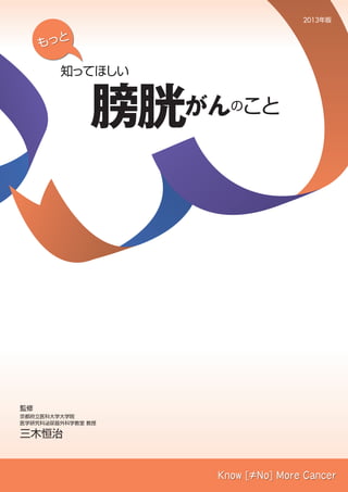 Cancer 膀胱がんのこと もっと 監修 京都府立医科大学大学院 医学研究科泌尿器外科学教室 教授 三木恒治 2015年版 本冊子には、国内未承認の内容が含まれています。実際の使用にあたっては、各製品の最新の添付文書をご参照ください