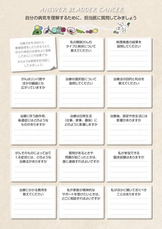ANSWER BLADDER CANCER 私や家族が精神的な サポートを受けたいときは、 どこに相談すればよいですか 私がほかに聞いておくべき ことはありますか 治療にかかる費用を 教えてください 質問があるときや 問題が起こったときは、 誰に連絡すればよいですか 私が参加できる 臨床試験はありますか がんそのものによって出て くる症状には、どのような 治療法がありますか 治療は日常生活 (仕事、家事、趣味)に どのように影響しますか 治療後、排尿や性生活には 影響がありますか 治療に伴う副作用、 後遺症にはどのような ものがありますか 治療の選択肢について 説明してください 治療法の目的と利点を 教えてください がんはリンパ節や ほかの臓器にも 広がっていますか 私の膀胱がんの タイプと病状について 教えてください 病理検査の結果を 説明してください 治療方針を決めたり、 健康管理をしたりするうえで、 自分の病気の状態をよく理解 しておくことが必要です。 次のような質問を担当医に してみましょう。 自分の病気を理解するために、担当医に質問してみましょう