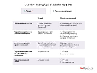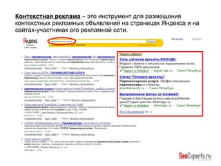 Документ описывает контекстную рекламу на платформе Яндекс, включая её виды, такие как поисковая и тематическая реклама. Упоминаются таргетинг, инструменты и стратегии для создания эффективных рекламных объявлений, а также важные аспекты планирования бюджета. Также перечисляются требования к рекламным материалам и факторы, влияющие на цену клика и кликабельность объявлений.