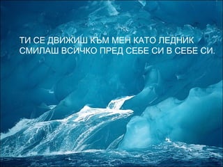 Поетичен текст на Александър Калчев, в който се описва среща между лирическия герой и еднообразна и безчувствена фигура, аналогична на ледник. Героят изпитва емоционално притяжение и жажда за човечност в лицето на другия, опитвайки се да възвърне губената свързаност между хората. Възможността за изменение и топене на ледовете между тях е същевременно надежда и заплаха.