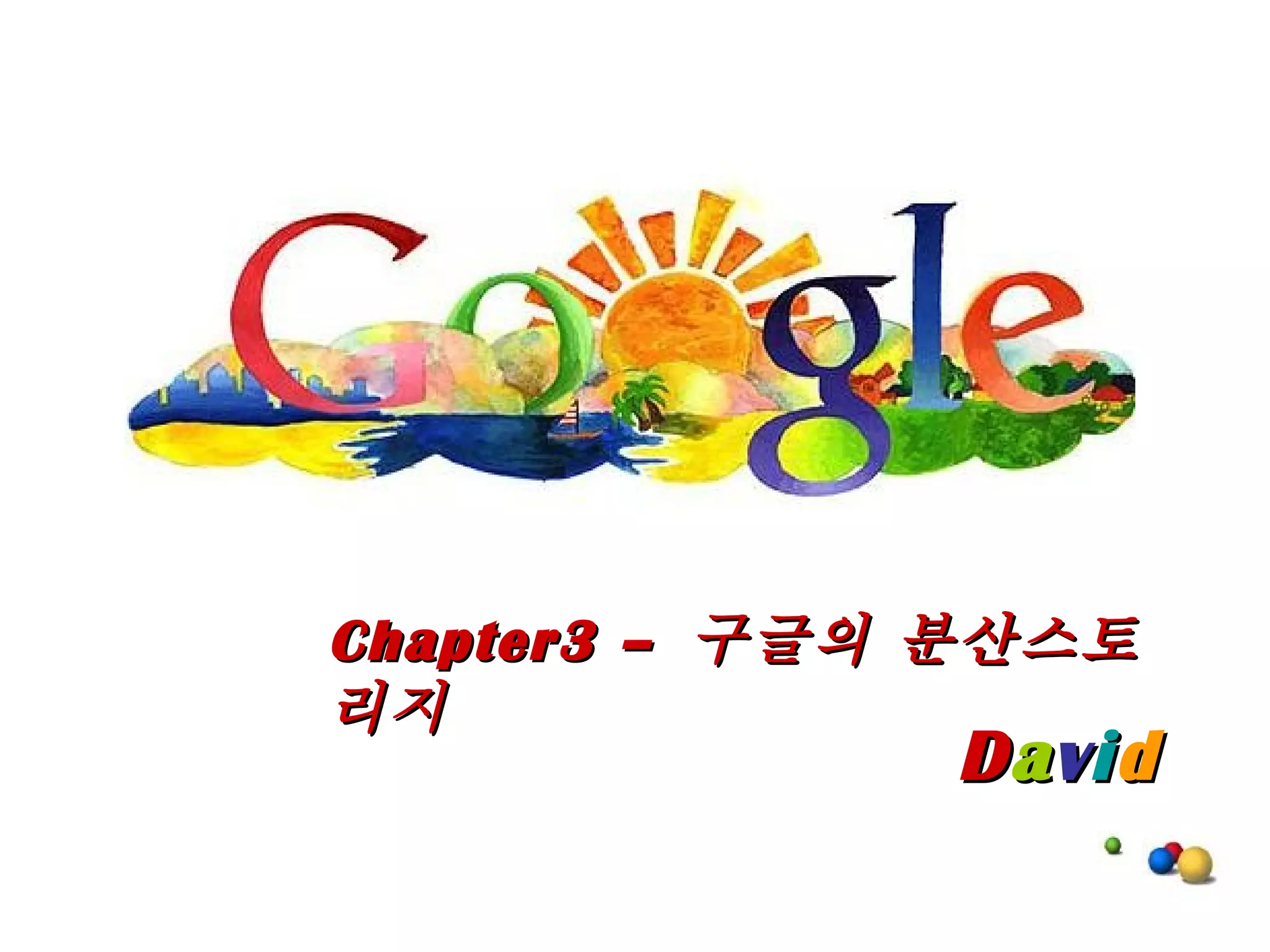 검색 클러스터 구조이용자의 검색요청 - 로드벨런스 (LB) 가 이를 분배 -GWS 중 하나연결 LB 는 GWS 의 동작을 항상 감시 부하가 가벼운 GWS 에 처리 맡김 GWS 는 이용자의 검색 요청을 분석한 후 인덱스 서버에게 처리 의뢰 인덱스 서버는 미리 준비한 인덱스를 이용해 검색한 후 웹페이지 목록을 돌려줌 GWS 는 도큐먼트 서버에게 인덱스 서버가 찾아낸 목록 전달 도큐먼트 서버는 웹페이지 제목 및 요약 등의 정보를 만들어냄 GWS 는 보기 편하게 HTML 로 정리 해서 이용자에게 전달 # 숫자를 늘리면 얼마든지 부하를 분산 시킬 수 있는 GWS 와는 달리 인덱스 서버 , 도큐먼트 서버에 부하가 집중되므로 분산 이 중요 검색클러스터 LB GWS 인덱스서버 GWS GWS 도큐먼트서버