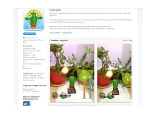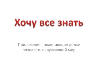 В документе рассмотрены плюсы и минусы различных приложений для детей, помогающих познавать окружающий мир. Основные плюсы включают красочный дизайн, интуитивное управление и наличие инструкций, тогда как минусы связаны с неинтуитивным интерфейсом, отсутствием вовлечения и возможностями взаимодействия. Также указаны контактные данные автора.