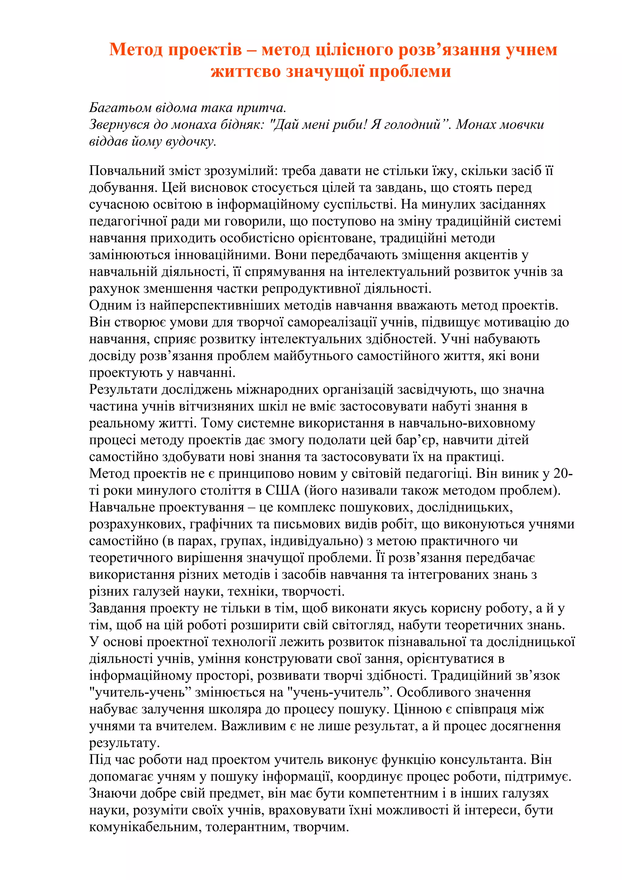 Метод проектів –метод цілісного розв’язання учнем