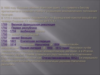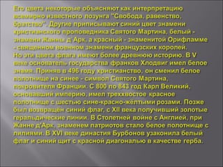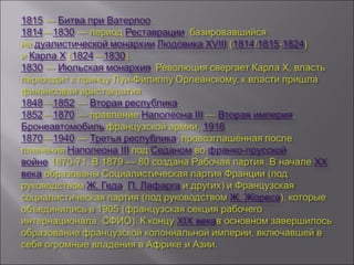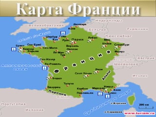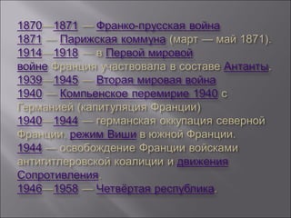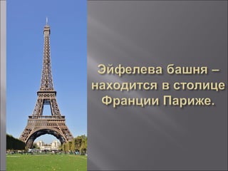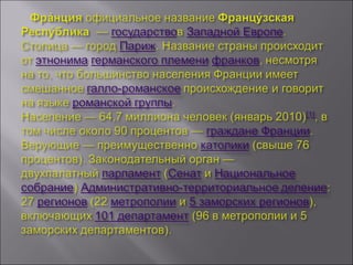Документ описывает историю Франции, в частности, укрепление централизованного государства к концу XV века и символ Франции — Эйфелеву башню, которая была построена для Всемирной выставки 1889 года. Также упоминаются географические особенности страны, ее территориальный размер и морские границы. В документе также объясняется происхождение современного государственного флага Франции — триколора.