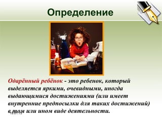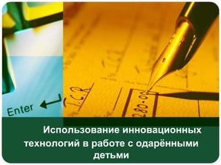 Документ обсуждает использование инновационных технологий в учебном процессе с одарёнными детьми и определяет их как детей с выдающимися способностями и креативностью. Основные принципы работы включают междисциплинарный подход, углублённое изучение выбранных тем и поощрение креативных результатов. Также документ описывает условия для индивидуализации обучения через различные формы внеурочной деятельности и творческих конкурсов.