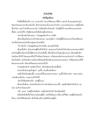 “ก็ตนไม้เลื้อยชนิ ดหนึ่ง ใบเหมือนใบปาล์ม กิ่งก้านมันยาวเลื้อย เหมือนเชือกน่ะใช้มดอะไรๆ ก็ ้ ั ได้ และหวายเส้นนี้ยาวมาก ยาวจนพับได้รอบแผ่นดินเจ็ดทวีปกับอีกเจ็ดมหาสมุทร...แกหยุดเงียบกริ บไป อย่างกะทันหันทีเดียวนะ เป็ นอย่างไร” ชายนั้นถามและเหลียวมาดูเด็กที่บนหลัง “เรื่ องของคุณสนุกดีมาก” เด็กตอบ แต่ที่จริ งแล้วเขาไม่เชื่ อคาพูดของชายผูน้ นแม้แต่คาเดียว ้ ั “ครั้ งหนึ่งน่ะ” ชายผูน้ นเล่าต่อ “มีบานหลังหนึ่ง ใหญ่โตที่สุดที่แกเคยเห็น มันทั้งใหญ่ท้ งสู ง ้ ั ้ ั จนกระทังถ้าใครโยนไข่ไก่ลงมาจากหลังคาบ้านหลังนั้น ไข่จะแตกออกเป็ นลูกไก่ แล้วจะกลายเป็ นไก่ตว ่ ั โตๆ เสี ยตั้งแต่มนยังตกลงมาไม่ถึงพื้นดินแน่ะ” ั “โอ้โฮ!” เด็กนั้นร้องอุทาน “บ้านอะไรใหญ่อย่างนั้น...เอ้า ทีน้ ีถึงตาของผมบ้างแล้ว ผมจะเล่า นิทานให้คุณฟัง” เด็กนั้นยังคงดาเนินแผนการที่คิดว่าจะหนี “เออ! ดี” ชายผูน้ นพูด “ตอนนี้ ทองเป็ นอย่างไรบ้างล่ะ” ้ ั ้ “ค่อยยังชัวนิดหนึ่งครับ ขอบคุณ ผมคิดว่าคงจะหายเป็ นปลิดทิง ถ้าผมเล่าเรื่ องของผมให้คุณฟัง ่ ้ บ้างแล้ว” “ดี ถ้าอย่างนั้นก็เล่าไปซี ” ั “เอาละครับ เรื่ องของผมนั้น เป็ นเรื่ องกลองใบใหญ่มหึ มา ซึ่ งเขาใช้กนนานนักหนาแล้วมันใหญ่ เสี ยจนกระทัง ถ้ามีใครตีกลองนี้ข้ ึน คนทุกๆ คนในโลกนี้ ตลอดขึ้นไปจนถึงเทวดานางฟ้ าบนสวรรค์ที่จะ ่ ั ได้ยนเสี ยงกลองใบนี้กนทั้งนั้น” ิ “เฮ้ย! เหลวไหล” ชายผูน้ นขัดคอ “กลองอะไรจะใหญ่อย่างนั้น” ้ ั