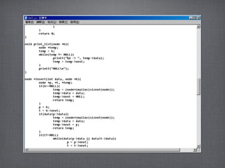 This document contains the code for various operations on singly linked lists in C language such as insertion, deletion, searching, counting, reversing, merging, and splitting nodes. It includes function definitions and main program to demonstrate a menu driven program to perform these operations and print the list. The functions work recursively to traverse the list and perform the desired operation by updating next pointers.