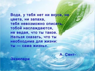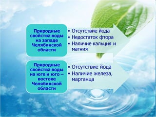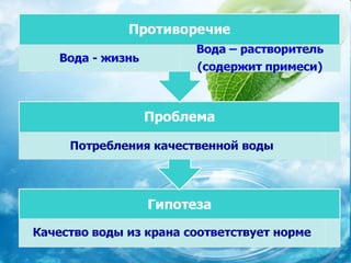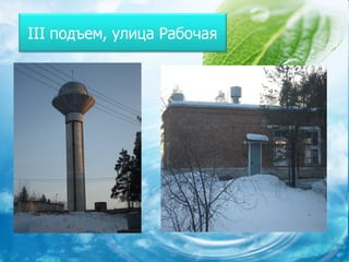 Документ исследует качество воды из крана в городе Трехгорном, анализируя её путь от водозабора до квартир и влияние на здоровье. Установлено, что подземные воды проходят многоступенчатую очистку, однако предметом заботы остаются недостатки в составе, такие как нехватка йода и фтора, а также возможные загрязнения при прохождении через старые трубы. Для улучшения качества воды предлагаются различные методы её очистки и профилактики дефицита необходимых микроэлементов.