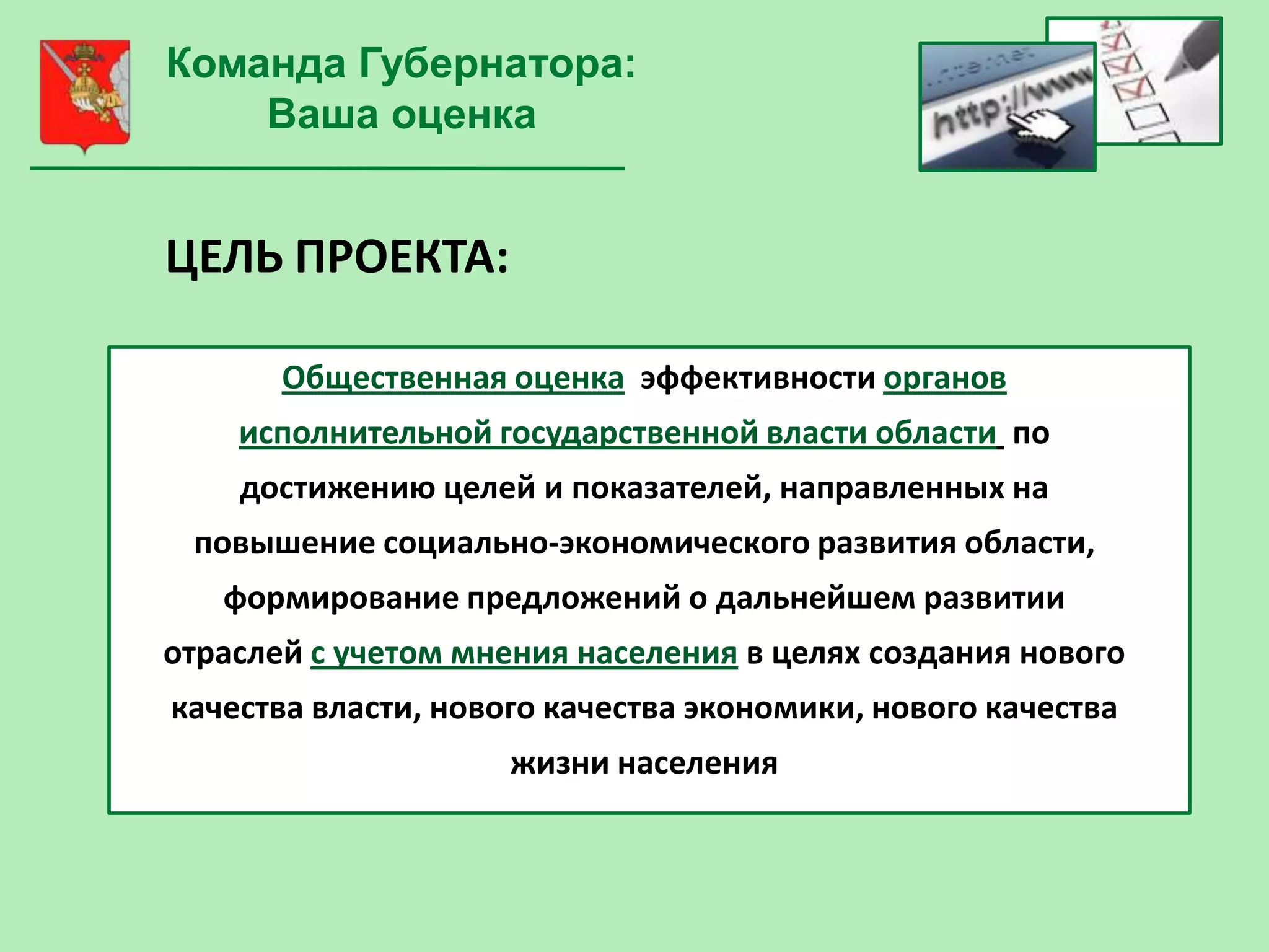 Документ описывает проект 'Команда губернатора: ваша оценка', целью которого является общественная оценка эффективности органов власти Вологодской области для улучшения социально-экономического развития. Проект включает формирование системы управления результативностью, разработку методов оценки и повышение ответственности властей, а также предполагает интерактивный диалог с населением и создание системы управления по результатам. Ожидается внедрение современных технологий и улучшение качества жизни населения через активное вовлечение общественности.