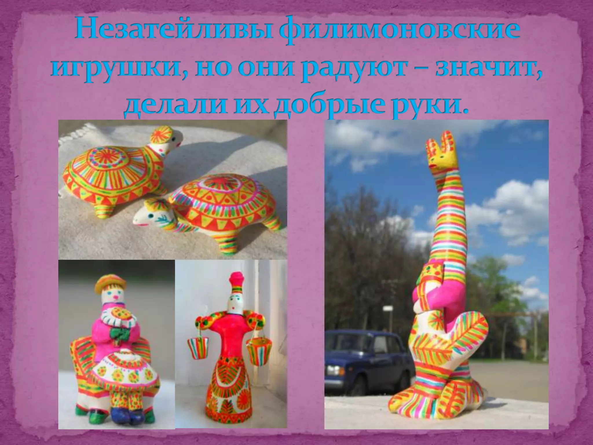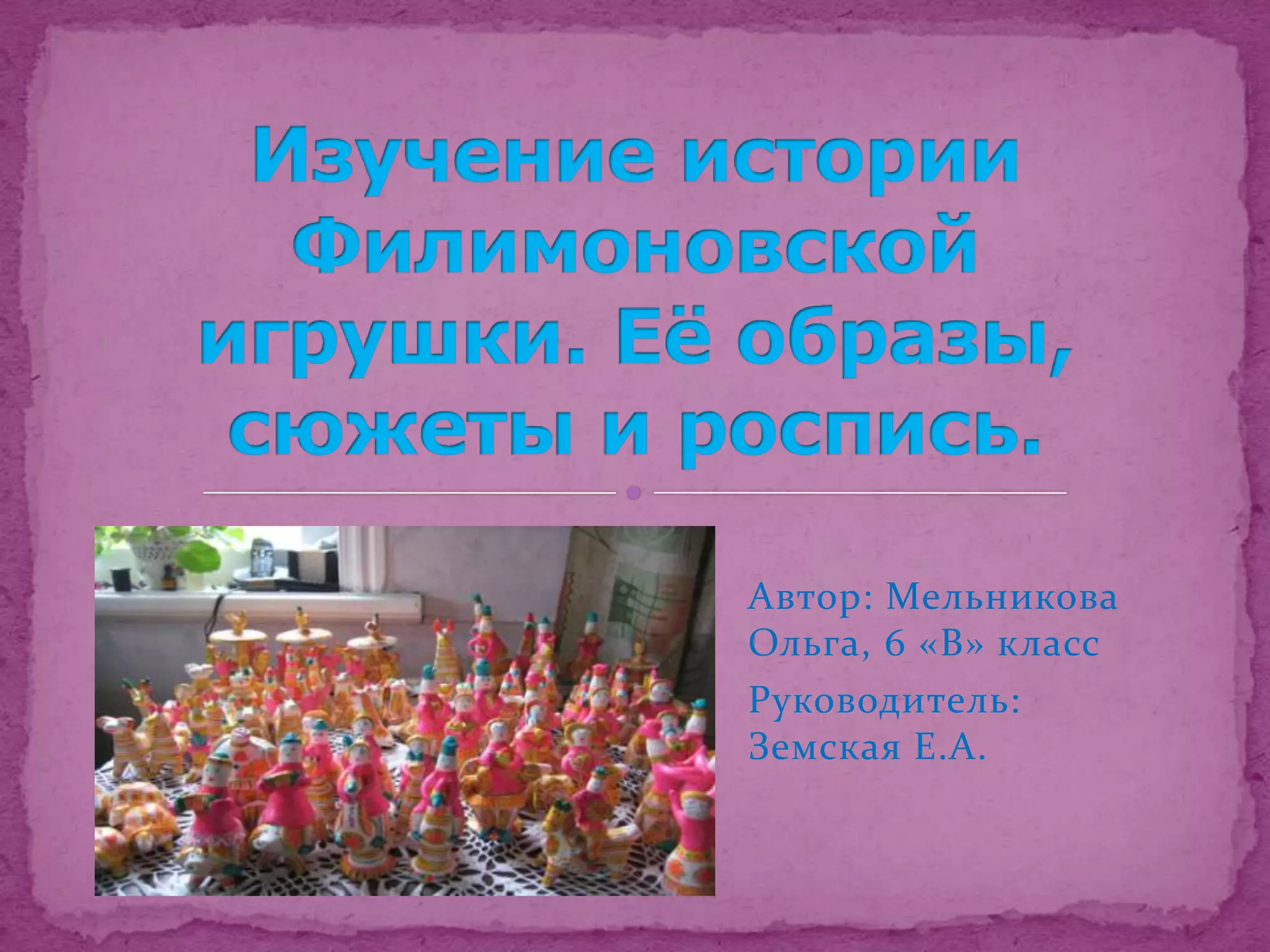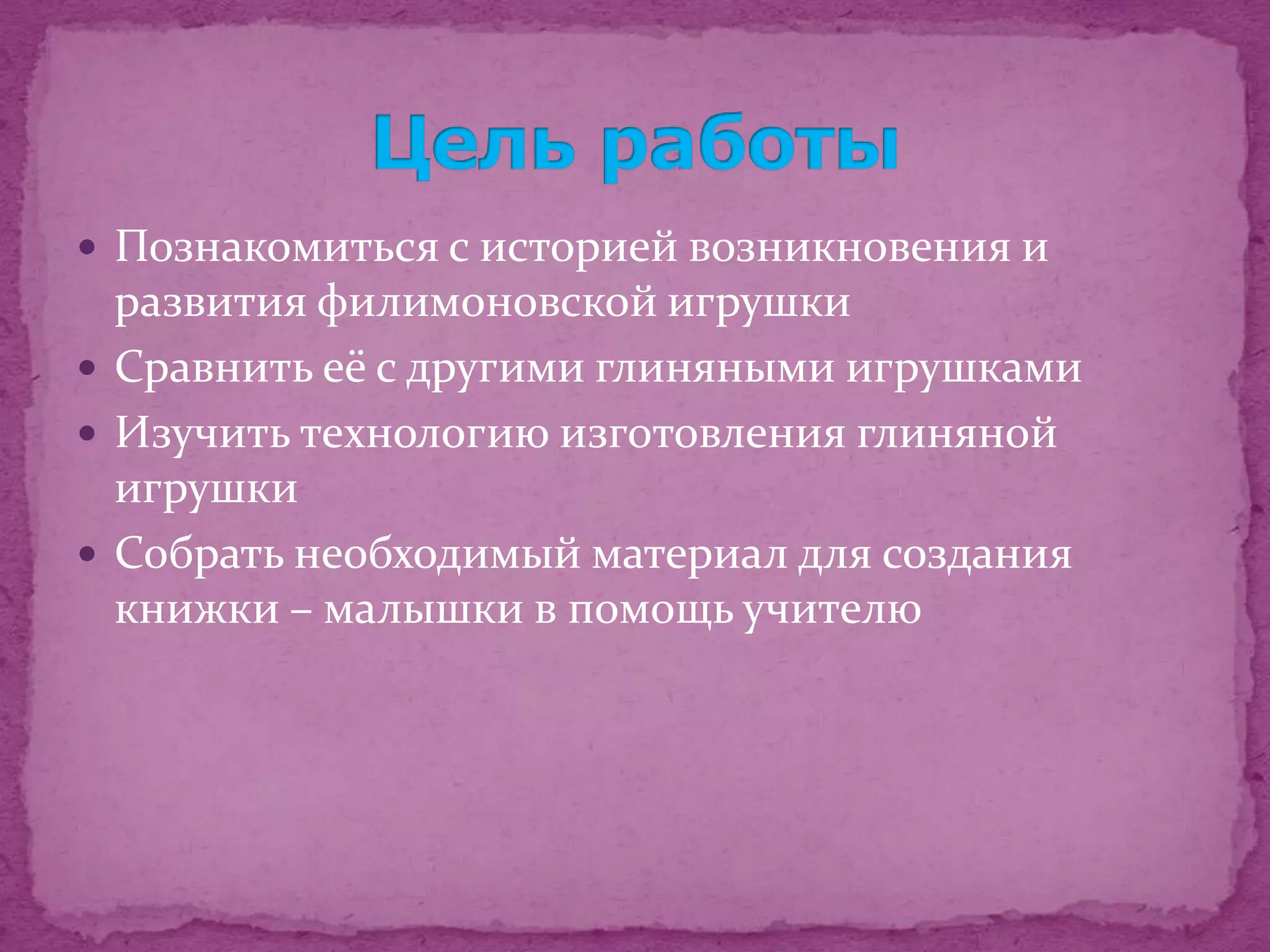 Документ описывает исследование и создание коллекции филимоновских игрушек, направленное на знакомство школьников с русскими народными традициями. Автор, ученица 6 класса, анализирует историю, технологии и культурное значение игрушек, а также собирает материал для создания пособия для учителей. Основная цель работы - восстановить интерес к народным промыслам и сохранить память о них для будущих поколений.