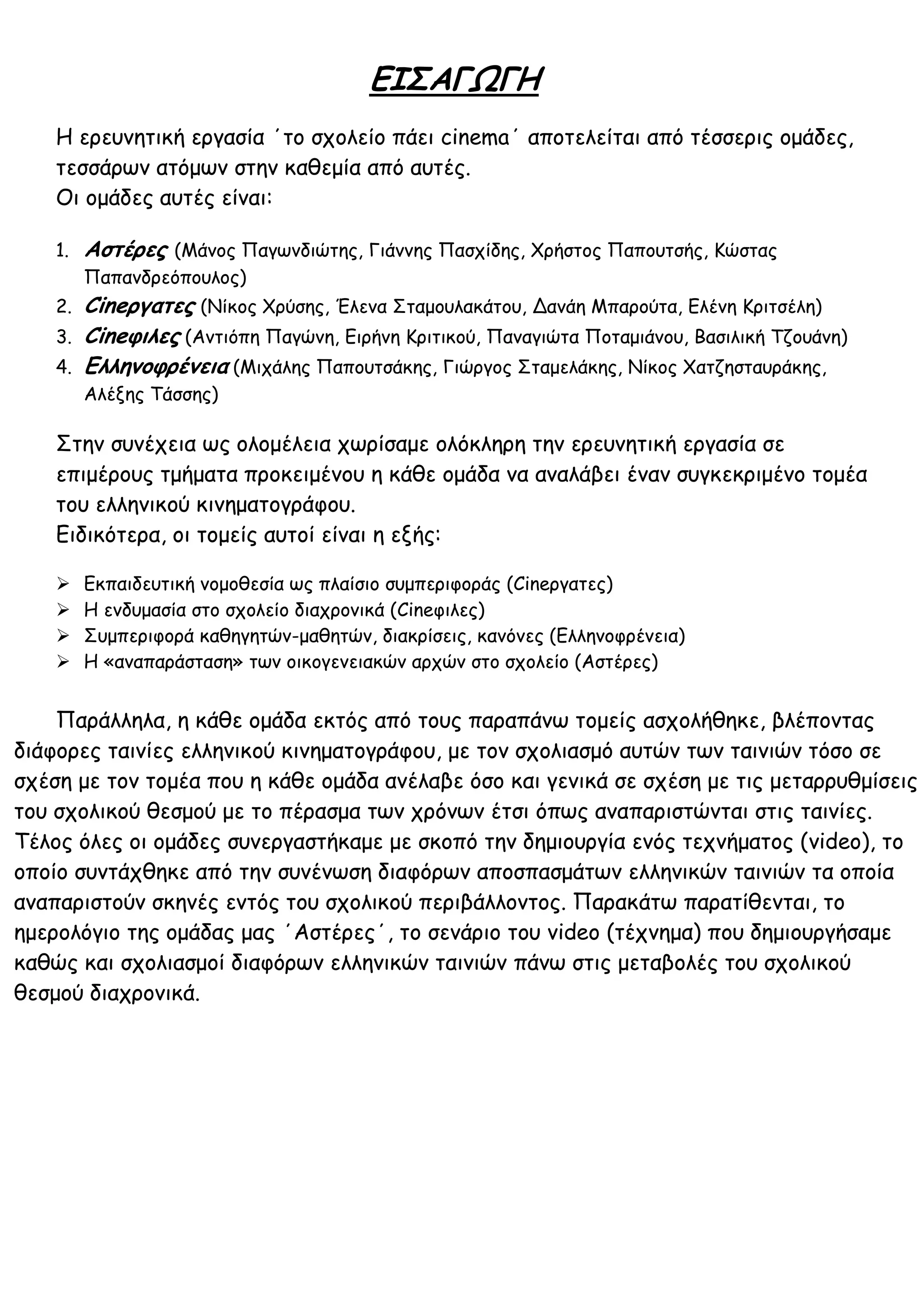 Η ερευνητική εργασία ΄το σχολείο πάει cinema΄ αποτελείται από τέσσερις ομάδες,