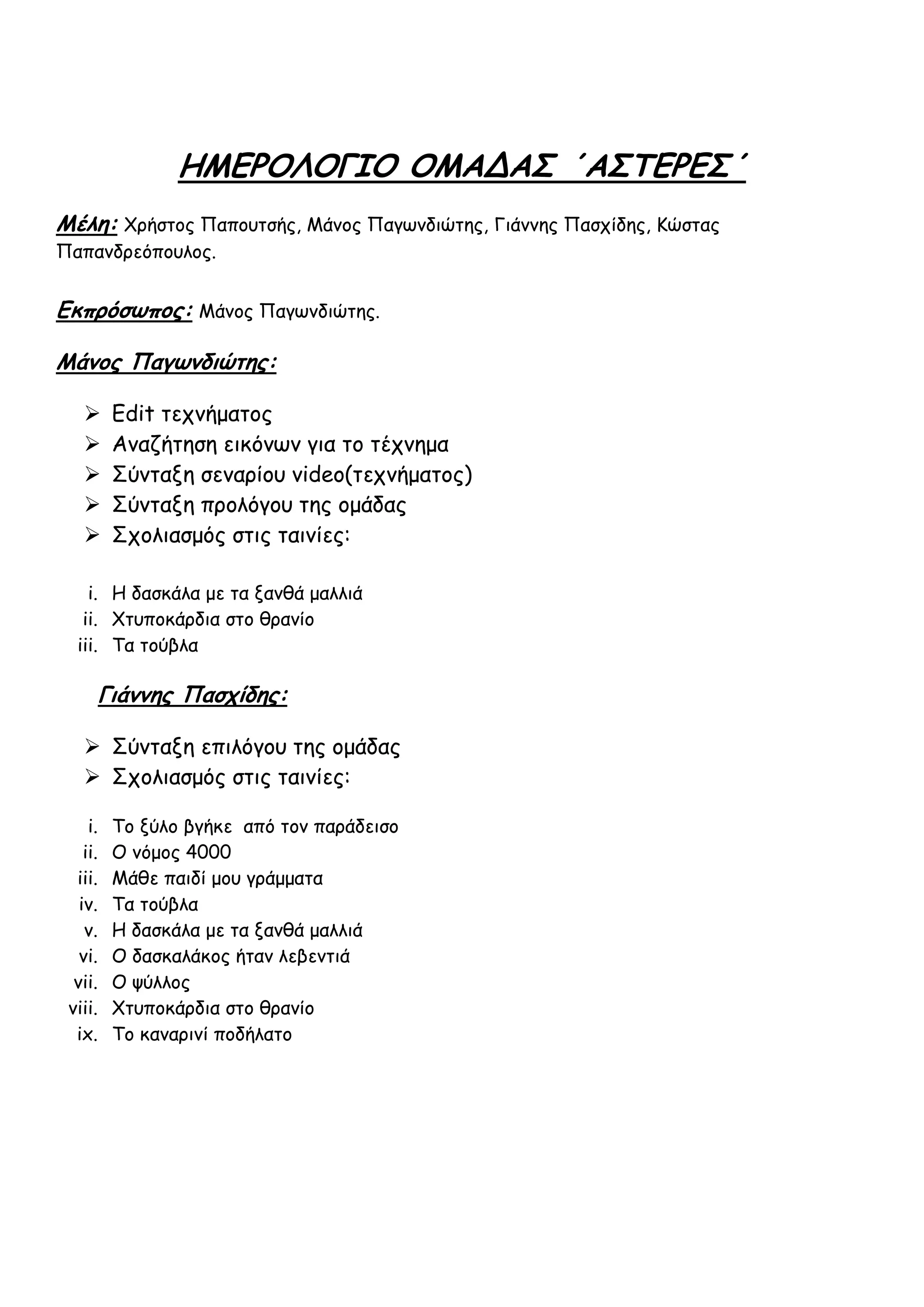 ημερολόγιο της ομάδας μας ΄Αστέρες΄, το σενάριο του video (τέχνημα) που δημιουργήσαμε