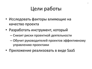 В дипломной работе описывается разработка SaaS-приложения для управления проектами с целью снижения рисков и повышения качества проектной деятельности. Основное внимание уделяется исследованию факторов, влияющих на качество проекта, и разработке системы управления, обеспечивающей эффективное взаимодействие между участниками команды. В работе также выделяются основные ошибки в проектном управлении и предлагаются решения, включая обучение руководителей проектами.