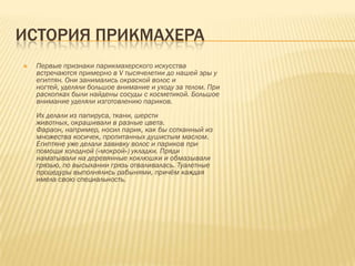 Документ описывает историю парикмахерского искусства с древнеегипетских времен, начиная с V тысячелетия до н.э. Египтяне занимались окраской волос и ногтей, а также изготавливались парики из различных материалов. Упоминаются туалетные процедуры, которые выполнялись рабынями с особыми специальностями.