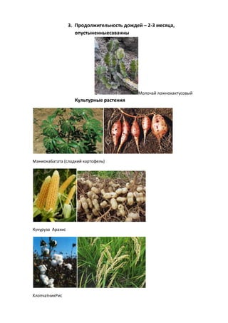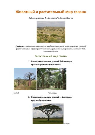 Документ описывает животный и растительный мир саванн, охватывающих 40% территории Африки, с характеристиками различных экосистем. Упоминаются разнообразные виды растений, включая деревья и культурные культуры, а также крупные травоядные и хищные животные, обитающие в этом регионе. Также обсуждаются особенности климата саванн и продолжительность дождей в различных типах саванн.