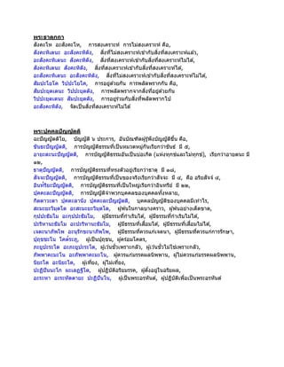 ั สงคะโห อะสงคะโห, การสงเคราะห์ การไม่สงเคราะห์ คือ, ั ั ิ่ ่ สงคะหิเตนะ อะสงคะหิตัง, สงทีไม่สงเคราะห์เข ้ากับสงทีสงเคราะห์แล ้ว,ิ่ ่ ั ั ิ่ ่ ิ่ ่ อะสงคะหิเตนะ สงคะหิตัง, สงทีสงเคราะห์เข ้ากับสงทีสงเคราะห์ไม่ได ้, ั ั ิ่ ่ สงคะหิเตนะ สงคะหิตง, สงทีสงเคราะห์เข ้ากับสงทีสงเคราะห์ได ้, ั ิ่ ่ ั ั ิ่ ่ ิ่ ่ อะสงคะหิเตนะ อะสงคะหิตัง, สงทีไม่สงเคราะห์เข ้ากับสงทีสงเคราะห์ไม่ได ้, ั สมปะโยโค วิปปะโยโค, การอยูด ้วยกัน การพลัดพรากกัน คือ, ่ ั สมปะยุตเตนะ วิปปะยุตตัง, การพลัดพรากจากสงทีอยูด ้วยกัน ิ่ ่ ่ ั วิปปะยุตเตนะ สมปะยุตตัง, การอยูรวมกับสงทีพลัดพรากไป ่ ่ ิ่ ่ ั ิ่ ่ อะสงคะหิตัง, จัดเป็ นสงทีสงเคราะห์ไม่ได ้ พระปุคคลปัญญ ัตติ ฉะปั ญญัตติโย, บัญญัต ิ ๖ ประการ, อันบัณฑิตผู ้รู ้พึงบัญญัตขน คือ, ิ ึ้ ขันธะปั ญญัตติ, การบัญญัตธรรมทีเป็ นหมวดหมูกันเรียกว่าขันธ์ มี ๕, ิ ่ ่ อายะตะนะปั ญญัตติ, การบัญญัตธรรมอันเป็ นบ่อเกิด (แห่งทุกข์และไม่ทกข์), เรียกว่าอายตนะ มี ิ ุ ๑๒, ธาตุปัญญัตติ, การบัญญัตธรรมทีทรงตัวอยูเรียกว่าธาตุ มี ๑๘, ิ ่ ่ ั ั สจจะปั ญญัตติ, การบัญญัตธรรมทีเป็ นของจริงเรียกว่าสจจะ มี ๔, คือ อริยสจจ์ ๔, ิ ่ ั อินท๎ รยะปั ญญัตติ, การบัญญัตธรรมทีเป็ นใหญ่เรียกว่าอินทรีย ์ มี ๒๒, ิ ิ ่ ปุคคะละปั ญญัตติ, การบัญญัตจาพวกบุคคลของบุคคลทังหลาย, ิ ้ กิตตาวะตา ปุคคะลานั ง ปุคคะละปั ญญัตติ, บุคคลบัญญัตของบุคคลมีเท่าไร, ิ สะมะยะวิมตโต อะสะมะยะวิมตโต, ผู ้พ ้นในกาลบางคราว, ผู ้พ ้นอย่างเด็ดขาด, ุ ุ กุปปะธัมโม อะกุปปะธัมโม, ผู ้มีธรรมทีกาเริบได ้, ผู ้มีธรรมทีกาเริบไม่ได ้, ่ ่ ่ ื่ ปะริหานะธัมโม อะปะริหานะธัมโม, ผู ้มีธรรมทีเสอมได ้, ผู ้มีธรรมทีเสอมไม่ได ้, ่ ื่ เจตะนาภัพโพ อะนุรักขะนาภัพโพ, ผู ้มีธรรมทีควรแก่เจตนา, ผู ้มีธรรมทีควรแก่การรักษา, ่ ่ ปุถชชะโน โคต๎ ระภู, ผู ้เป็ นปุถชน, ผู ้คร่อมโคตร, ุ ุ ั่ ภะยูปะระโต อะภะยูปะระโต, ผู ้เว ้นชวเพราะกลัว, ผู ้เว ้นชวไม่ใชเพราะกลัว, ั่ ่ ภัพพาคะมะโน อะภัพพาคะมะโน, ผู ้ควรแก่มรรคผลนิพพาน, ผู ้ไม่ควรแก่มรรคผลนิพพาน, นิยะโต อะนิยะโต, ผู ้เทียง, ผู ้ไม่เทียง, ่ ่ ปะฏิปันนะโก ผะเลฏฐิโต, ผู ้ปฏิบัตอริยมรรค, ผู ้ตังอยูในอริยผล, ิ ้ ่ อะระหา อะระหัตตายะ ปะฏิปันโน, ผู ้เป็ นพระอรหันต์, ผู ้ปฏิบัตเพือเป็ นพระอรหันต์ ิ ่