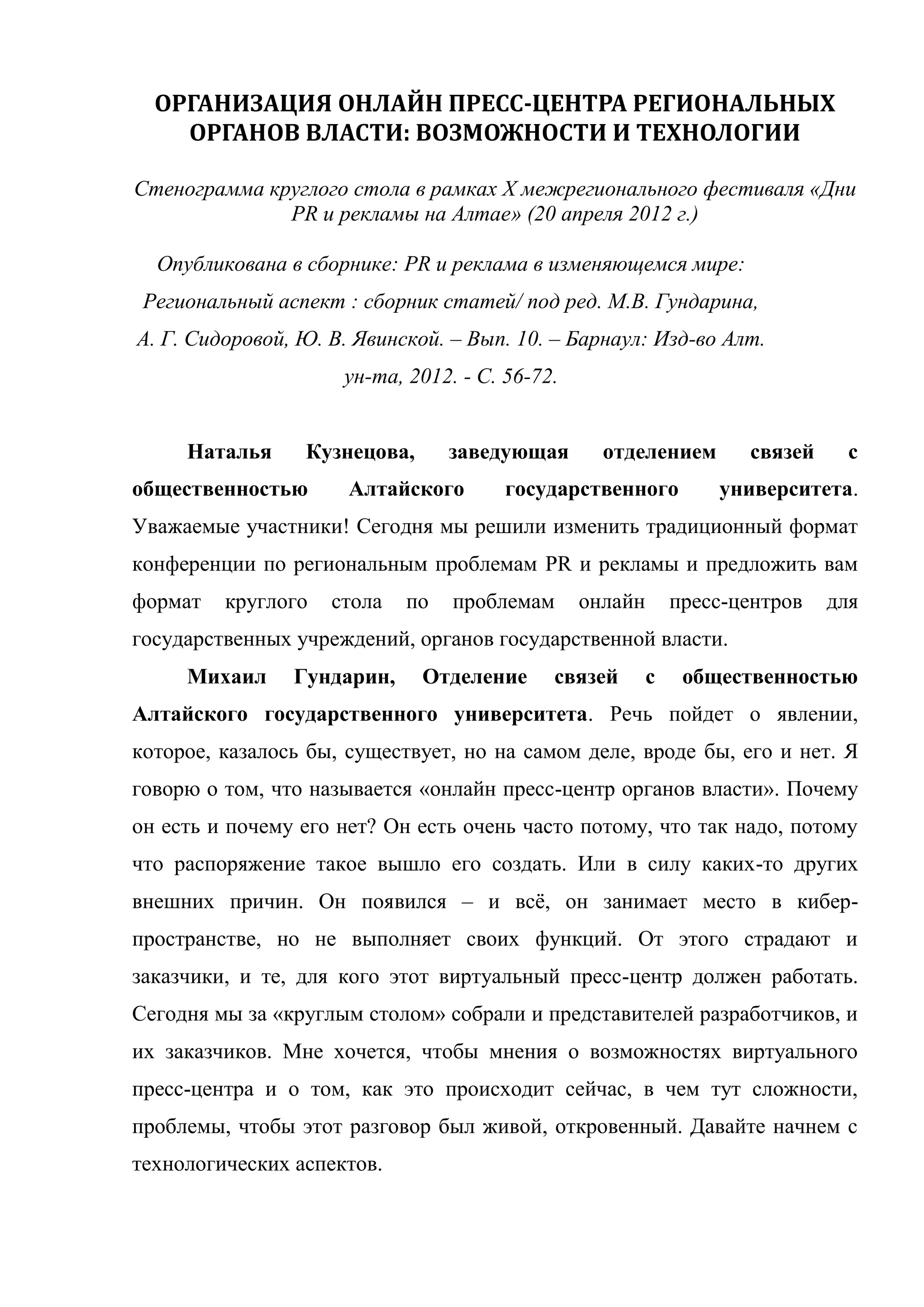 Документ содержит стенограмму круглого стола, посвященного проблемам онлайн-пресс-центров для органов власти, в ходе которого обсуждаются возможности и технологии, связанные с электронным документооборотом и функциональностью сайтов государственных учреждений. Участники говорят о необходимости улучшения этих технологий для повышения эффективности работы госучреждений и оптимизации взаимодействия с гражданами. Обсуждаются как позитивные аспекты внедрения новых технологий, так и существующие преграды, такие как недостаток финансирования и необходимость обучения кадров.