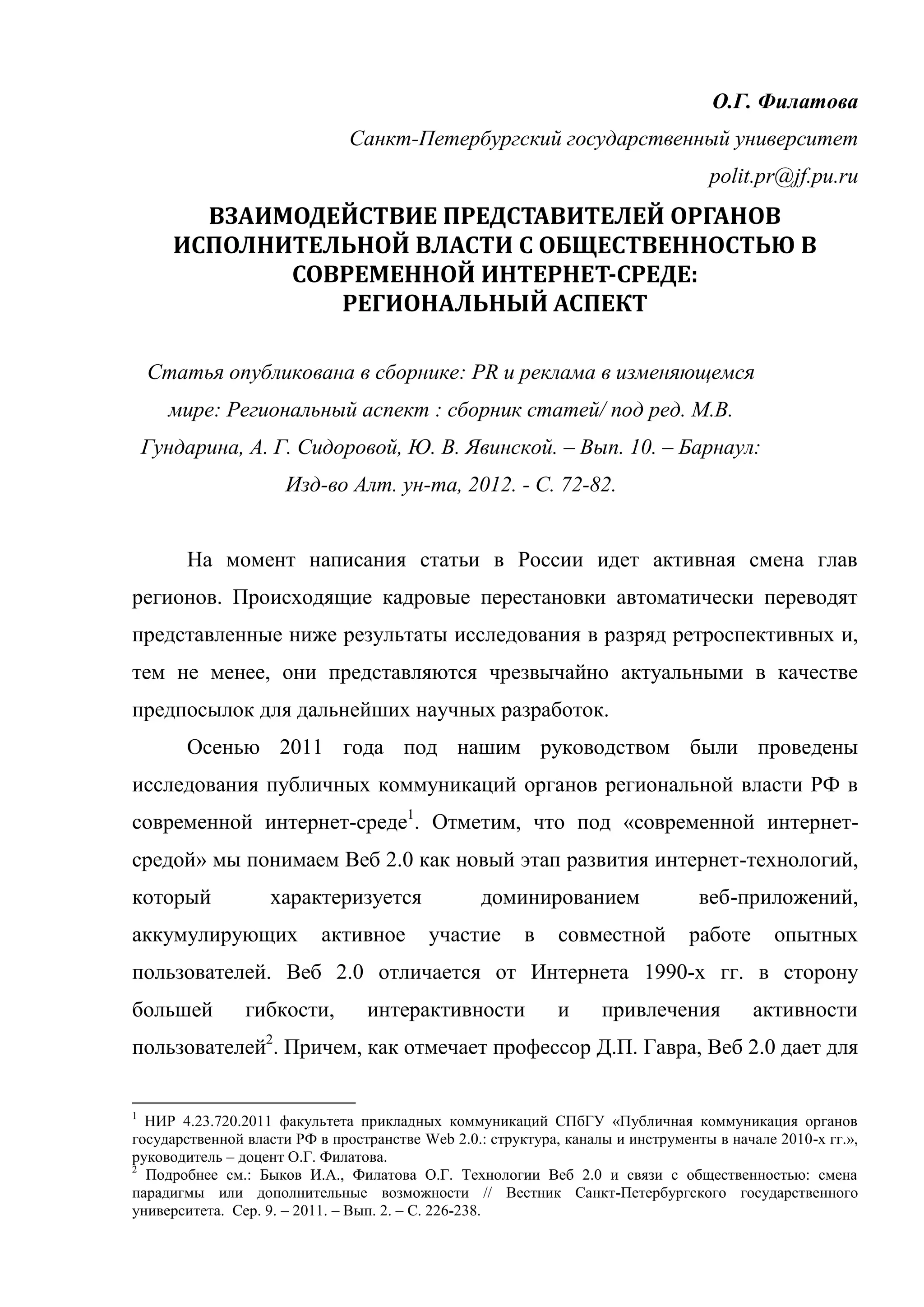 Статья анализирует взаимодействие представителей органов исполнительной власти России с общественностью в современных интернет-средах, акцентируя внимание на использовании блогов и микроблогов. Исследование показывает, что более 60% глав субъектов Федерации используют данные инструменты для коммуникации, однако степень их популярности и активности значительно варьируется. Результаты исследования подчеркивают важность и многообразие форматов публичных коммуникаций в контексте постоянно развивающегося веб 2.0.