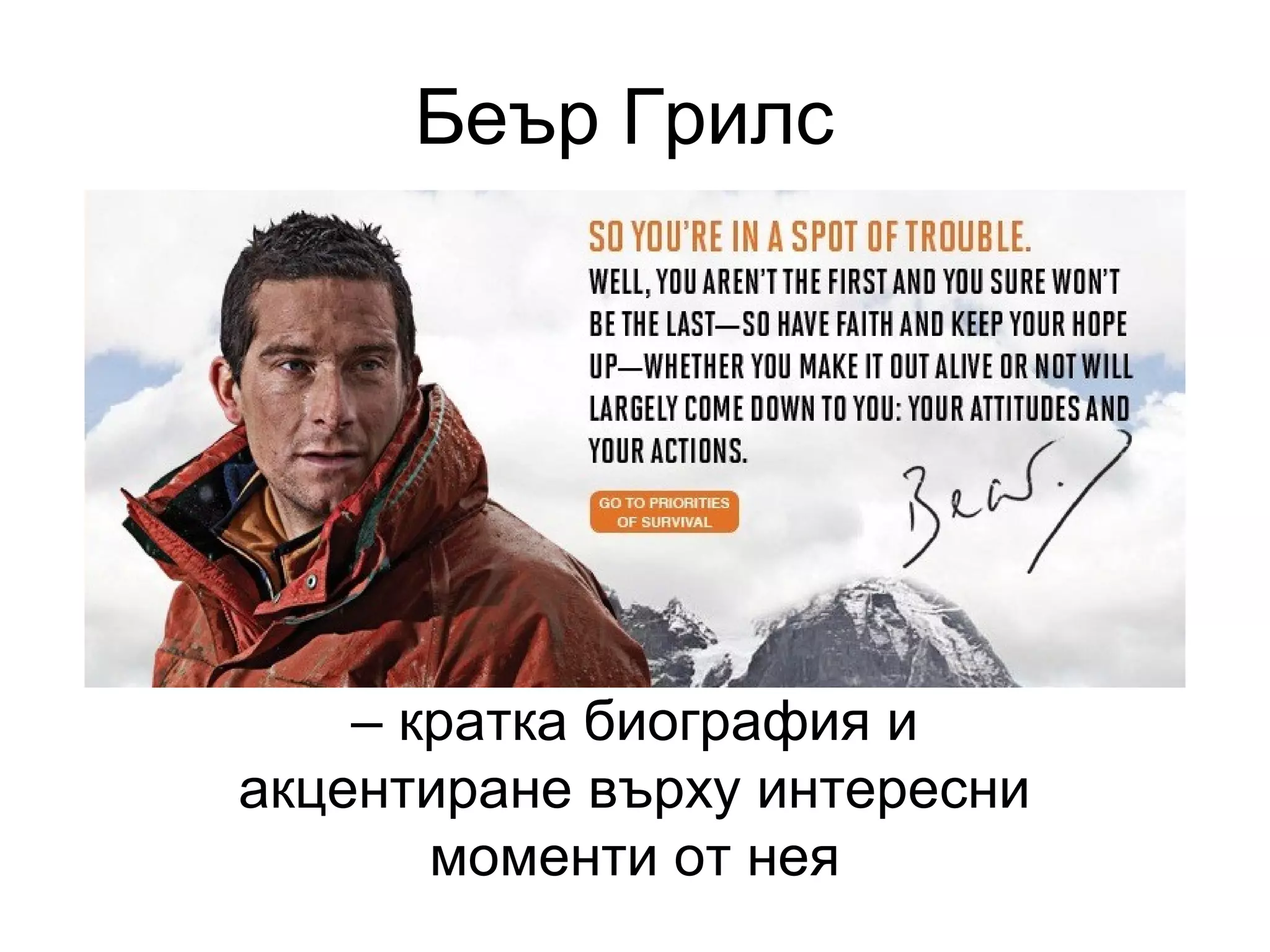 пътешественик, писател и телевизионен водещ. Най-известен е с предаването си Born Survivor (Man vs Wild
