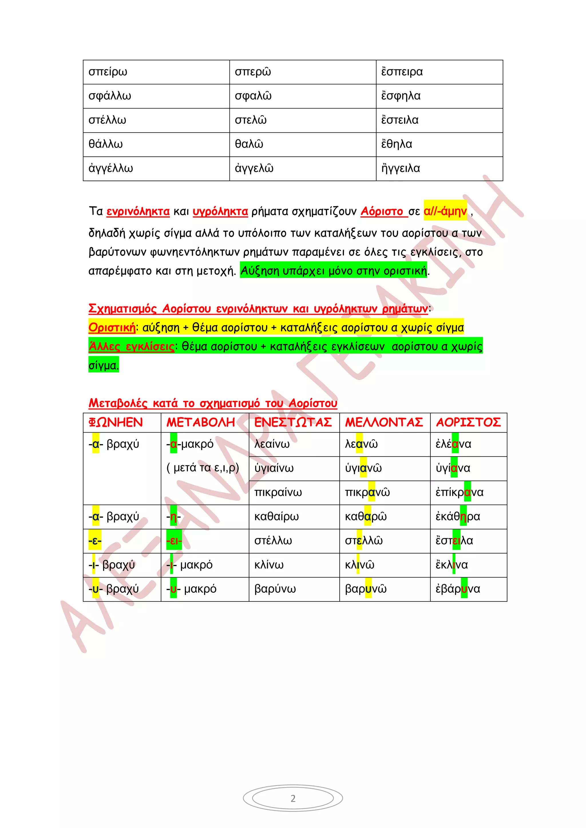 Σχηματισμός Αορίστου ενρινόληκτων και υγρόληκτων ρημάτων: