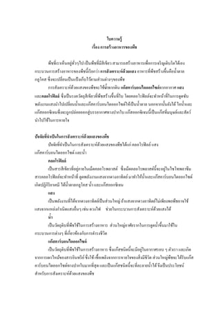 เรือง การสร้ างอาหารของพืช ่ ั พืชทีเราเห็นอยูทวๆไป เป็ นพืชทีมีสีเขียว สามารถสร้างอาหารเพือการเจริ ญเติบโตได้เอง กระบวนการสร้างอาหารของพืชนีเรี ยกว่า การสั งเคราะห์ ด้วยแสง อาหารทีพืชสร้างขึนคือนําตาล กลูโคส ซึ งจะเปลียนเป็ นแป้ งเก็บไว้ตามส่ วนต่างๆของพืช การสังเคราะห์ดวยแสงของพืชจะใช้นําจากดิน แก๊ สคาร์ บอนไดออกไซด์ จากอากาศ แสง ้ และคลอโรฟิ ลล์ ซึ งเป็ นรงควัตถุสีเขียวทีพืชสร้างขึนทีใบ โดยคลอโรฟิ ลล์จะทําหน้าทีในการดูดซับ พลังงานแสงนําไปเปลียนนําและแก๊สคาร์ บอนไดออกไซด์ให้เป็ นนําตาล นอกจากนันยังได้ ไอนําและ แก๊สออกซิ เจนซึ งจะถูกปล่อยออกสู่ บรรยากาศทางปากใบ แก๊สออกซิ เจนนีเป็ นแก๊สทีมนุษย์และสัตว์ นําไปใช้ในการหายใจ ปัจจัยทีจําเป็ นในการสั งเคราะห์ ด้วยแสงของพืช ปั จจัยทีจําเป็ นในการสังเคราะห์ดวยแสงของพืชได้แก่ คลอโรฟิ ลล์ แสง ้ แก๊สคาร์ บอนไดออกไซด์ และนํา คลอโรฟิ ลล์ ่ ่ เป็ นสารสี เขียวทีอยูภายในเม็ดคลอโรพลาสต์ ซึ งเม็ดคลอโรพลาสต์นีจะอยูในไซโทพลาซึ ม สารคลอโรฟิ ลล์จะทําหน้าที ดูดพลังงานแสงจากดวงอาทิตย์ มาทําให้นาและแก๊สคาร์ บอนไดออกไซด์ ํ เกิดปฏิกิริยาเคมี ได้นาตาลกลูโคส นํา และแก๊สออกซิ เจน ํ แสง เป็ นพลังงานทีได้จากดวงอาทิตย์เป็ นส่ วนใหญ่ ถ้าแสงจากดวงอาทิตย์ไม่เพียงพอพืชอาจใช้ แสงจากแหล่งกําเนิดแสงอืนๆ เช่น ดวงไฟ ช่วยในกระบวนการสังเคราะห์ดวยแสงได้ ้ นํา เป็ นวัตถุดิบทีพืชใช้ในการสร้างอาหาร ส่ วนใหญ่อาศัยรากในการดูดนําขึนมาใช้ใน กระบวนการต่างๆ ทีเกียวข้องกับการดํารงชีวิต แก๊ สคาร์ บอนไดออกไซด์ ่ เป็ นวัตถุดิบทีพืชใช้ในการสร้างอาหาร ซึ งแก๊สชนิดนีจะมีอยูในอากาศรอบ ๆ ตัวเรา และเกิด จากการเผาไหม้ของสารอินทรี ย ์ ซึ งใช้ เชือเพลิงจากการหายใจของสิ งมีชีวต ส่ วนใหญ่พืชจะได้รับแก๊ส ิ คาร์ บอนไดออกไซด์ทางปากใบมากทีสุ ด และเป็ นแก๊สชนิดนีจะทีละลายนําได้ จึงเป็ นประโยชน์ สําหรับการสังเคราะห์ดวยแสงของพืช ้