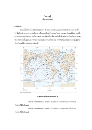 เรือง การเกิดลม การเกิดลม อากาศเมือได้รับความร้อนจะขยายตัว ทําให้มีความหนาแน่นน้อยกว่าปกติและลอยตัวสู งขึน ไป ซึ งเรี ยกว่า กระแสอากาศ เมืออากาศร้อนลอยตัวสู งขึน อากาศในแนวราบจากบริ เวณทีมีอุณหภูมิตา ํ กว่าเคลือนขนานกับแนวราบเข้ามาแทนที อากาศทีเคลือนทีขนานกับพืนผิวของโลก เรี ยกว่า 'ลม' ลมจะ พัดจากบริ เวณทีมีอุณหภูมิตากว่าหรื อบริ เวณทีมีความกดอากาศสู งกว่า ไปยังบริ เวณทีมีอุณหภูมิสูงกว่า ํ หรื อบริ เวณทีมีความกดอากาศตํากว่า ภาพแสดงหย่ อมความกดอากาศ หย่ อมความกดอากาศสู ง หมายถึง บริ เวณทีมีความกดอากาศสู งกว่าบริ เวณ ข้างเคียง ใช้ ตัวอักษร H หย่ อมความกดอากาศตํา หมายถึง บริ เวณทีมีความกดอากาศตํากว่าบริ เวณ ข้างเคียง ใช้ ตัวอักษร L