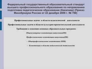 Документ описывает профессиональные и общекультурные компетенции современного учителя в рамках Федерального государственного образовательного стандарта высшего образования. Основное внимание уделяется задачам педагога в организации обучения и воспитания, а также формированию культуры мышления обучающихся. Также рассматриваются методы и технологии, необходимые для успешной реализации образовательного процесса.