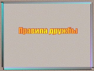 Документ содержит правила дружбы, подчеркивающие важность доверия, поддержки и взаимного уважения между друзьями. Также представлены пословицы о дружбе и анкета на тему дружеских отношений в классе. В анкете затрагиваются вопросы о взаимоотношениях между одноклассниками и важные качества, необходимые для поддержания дружбы.