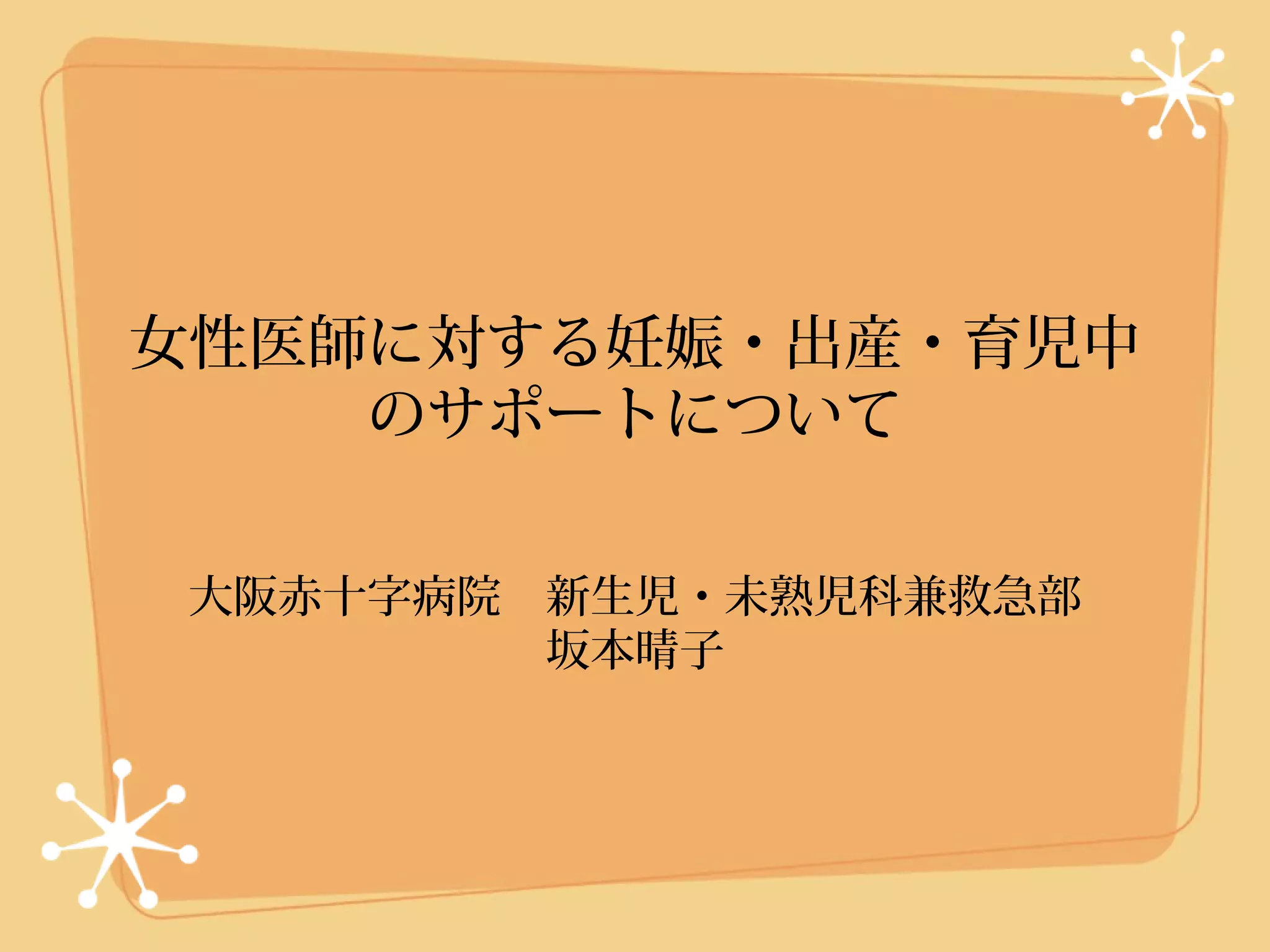 18. 19. 20. 21. Editor's Notes #4 参加者のバックグラウンドは?学生?初期研修医?後期研修医?小児科スタッフ?管理職? 基本的に楽天家。サラリーマン家庭の専業主婦の母親に育てられて成長。大学生時代は学年 100 人中女性 13 名。 女子医学生の会が開催されるもピンと来ず。 しかしポリクリ中に外科や泌尿器科で男子学生とは異なる扱いを先生方から受けて、違和感を持った。 そもそも医師を目指したのは生命誕生の不思議に惹かれたためだったが、病気であってもこどもたちのもつ生きるポジティブなパワーに魅力を感じて、産婦人科と小児科の選択を悩みつつ、最終的に幅広い疾患を扱える小児科を選んだ。 #6 不安が大きくて、妊娠がわかった瞬間(研修医2年目の冬)には泣いてしまいました。同期の内科専攻医には、中絶するの?とも言われ、みんなそんな必死な思いで研修していたんだなあと思います。 その時点では他科のスタッフ Dr 2名以外に出産経験のある女性 Dr はおらず、とても不安でした。ほぼ同時期に出産予定の産婦人科のスタッフ Dr といろいろ相談しながら乗り越えました。部長との関係が元々あまりよくはなかったので、精神的にしんどかったですが、他の小児科 Dr はいろいろと気遣ってくださりありがたかったです。夜当直をしていると、看護師さんに切迫流産や早産をされた方が多くて、気遣う言葉をかけてもらいました。勤務している病院で出産し、同期の産婦人科 Dr に主治医をしてもらい、娘を取り上げてもらえ、また私も出血が多かったのですが上の先生がすぐに来てくれたり、新生児の先生がすぐに診察に来てくれたり、心強かったです。 つわりもひどくて、タクシーで往復通勤していた時期もありました。まだ給料も安かったし、いつ終わるのかもわからずつらかったです。第2子の時は少し出血もあったので休みを取らせてもらいましたが、第1子のときは休むあるいは業務を軽減してもらうということは知識もなかったので全く思いつきませんでした。さすがに救急当直は同期に2回ほどかわってもらいました。 元部長の副院長の先生が、事務が作成した産休についての簡単な文書を見せてくれて、産後休暇は2ヶ月で、専攻医には育休はないということで、産後2か月で復帰することが決まりました。当直は産前は臨月までしていましたが、産後は4ヶ月まで免除してもらいました。8ヶ月になって保育所に入れるまでは私と娘だけ実家に住んで、実家から通勤していました。 #7 産前休暇1ヶ月、産後休暇2ヶ月(この間は基本無給となるが、これまでの有給休暇を消化したため1ヶ月分はお給料が出た) 自分の病院でお産したため、とても安心感があった。弛緩出血があり産科の上級医の先生が来てくれ、赤ちゃんの 24 時間診察には NICU の上級医の先生が来てくれた。授乳中にサマリーが出来てないから書けと、カルテを持って来た上級医もいた。 #8 夫の海外出張時、母の手術入院時の破綻 保育所の先生との出会い、ファミサポを紹介してもらう 事故予防や疾患についての講義、逆に NICU 同窓会に来て子どもとの遊びを指導してもらう #10 オリエンテーションで職員就業規則が配布され、その後も熟読している。 当初はスタッフ8人、レジデント1人体制。現在は小児科新生児科あわせてスタッフ9人、レジデント6人。小児病棟 55 床、 NICU 6床、 GCU 6床。 とりあえず1年間は新しい環境に慣れるのに必死。 台風で夜 9 時までお迎えにいけないこともあった。 #11 育児休暇中に、生まれるときから担当していた脳性麻痺の患者さんが亡くなり、こどもをベビーカーにのせてお見送りにいった。 #12 3人目妊娠前後に担当したメビウス症候群の児は、帝王切開、診断、リハビリと在宅移行を主治医として担当できてとても勉強できた患者さんです。 医療センターにお世話になっている間に、長女が不登校気味になってしまい、朝一緒に学校まで行ってから出勤するために、 30 分ほど遅刻させて頂いたりした時期もありました。 #16 保育料二人で 12 万円弱、学童保育料 2 万円 一時保育1日 2400 円から 3600 円 ファミリーサポートセンター 協力会員 1時間700−800円、兄弟割引あり 病児保育 1日 2000 円 #19 京都府立医大医学教育センター田邉智子先生 女性医師 VOICE :8人の女性医師へのインタビュー