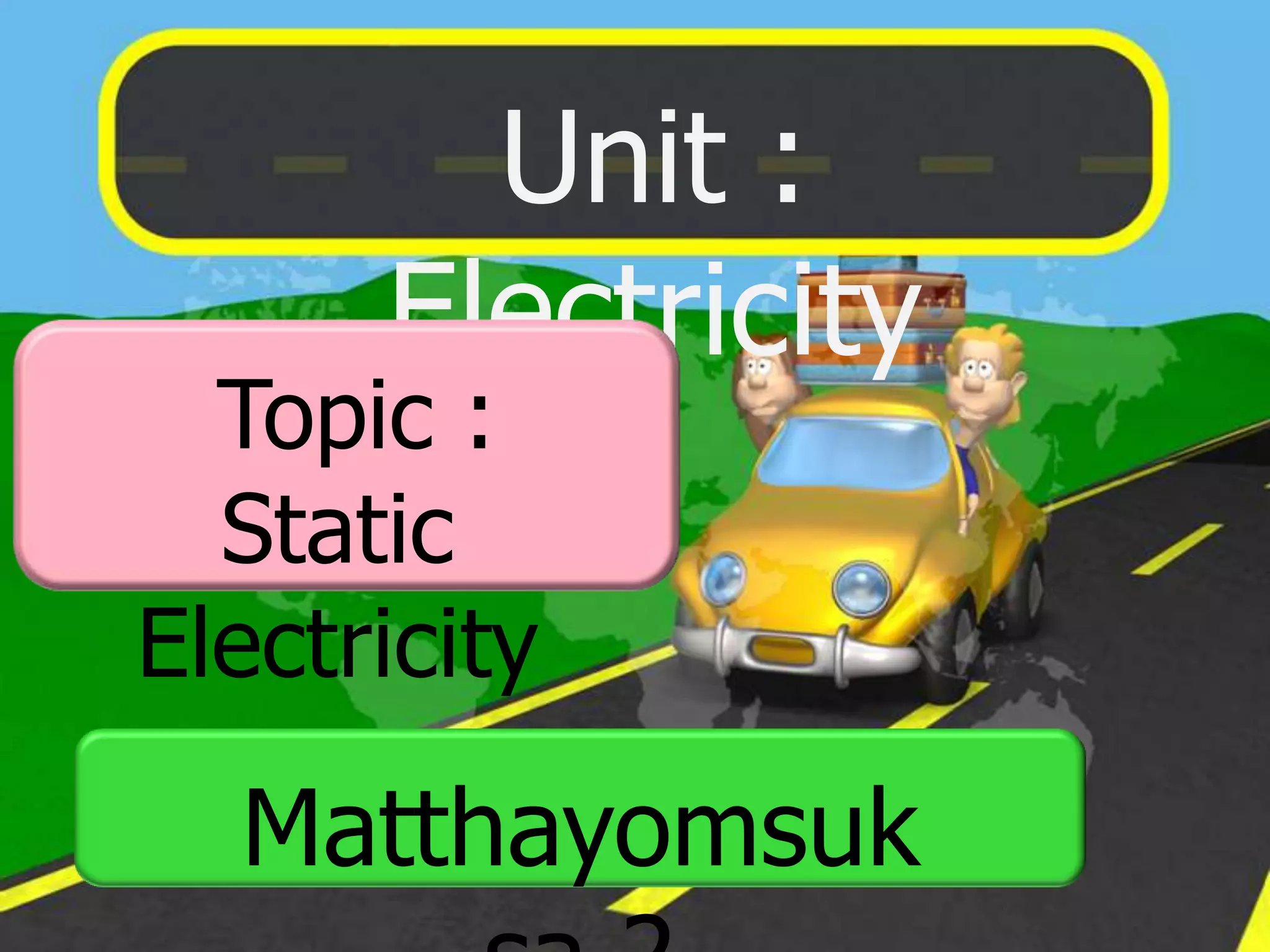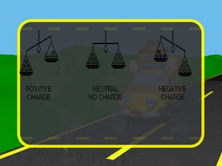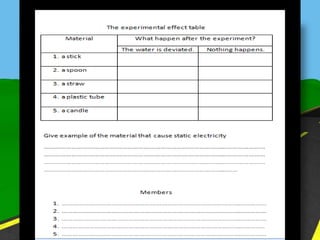 The document discusses static electricity through an experiment. It introduces key terms like electrons, insulators, and conductors. The experiment has students work in groups to observe how rubbing materials like a plastic cup or stick with a handkerchief causes a transfer of electrons, leaving one material positively charged and the other negatively charged. Through pouring water and using other materials, the students can see the effects of this transfer of static charge. The purpose is to demonstrate how static electricity works and which materials more easily allow electron movement.