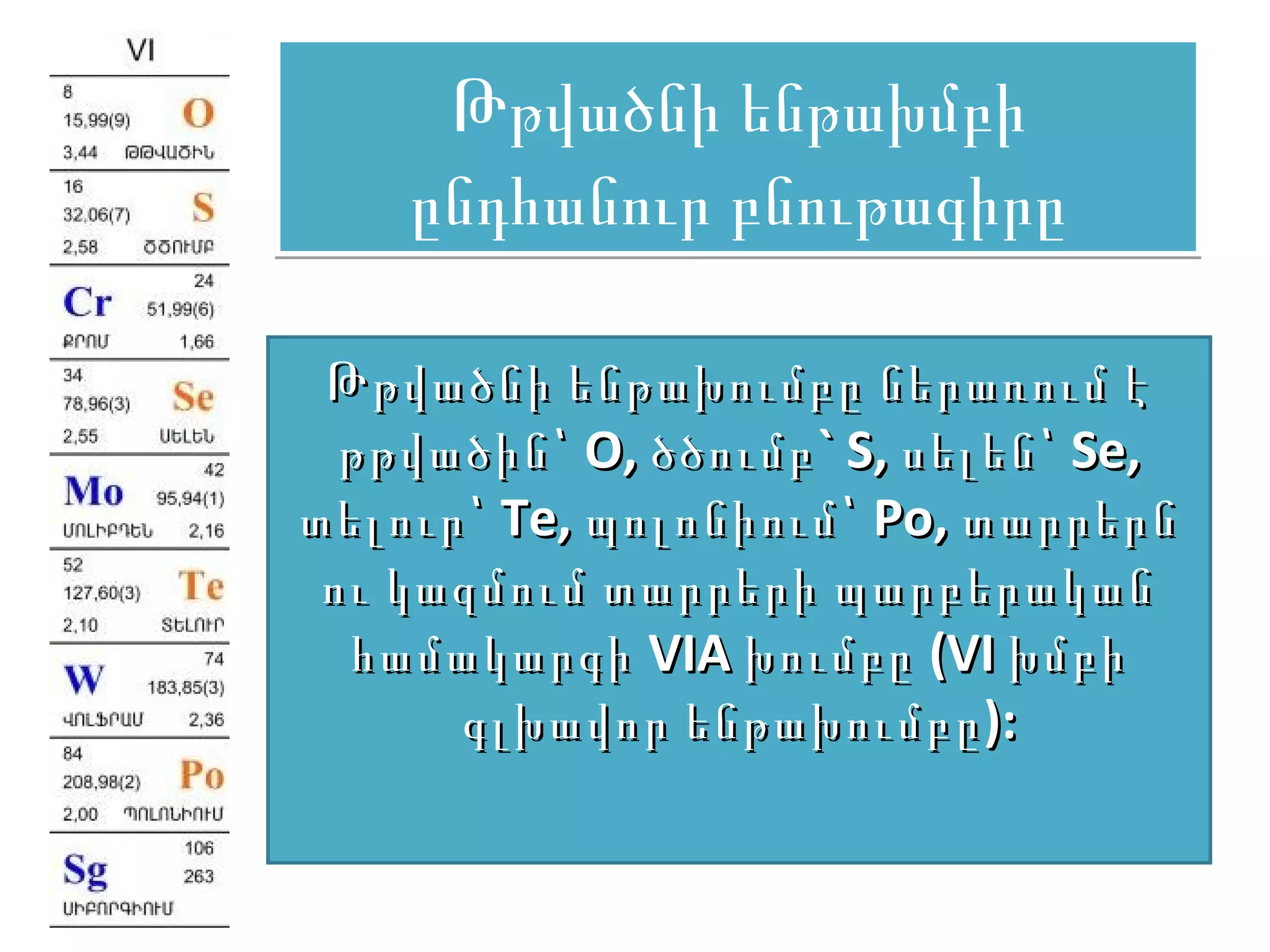 թթվածին՝ O, ծծումբ ` S, սելեն՝ Se,