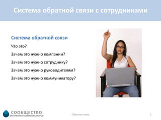Документ обсуждает важность и эффективность систем обратной связи в компаниях, подчеркивая их необходимость для сотрудников, руководителей и коммуникаторов. Основные проблемы, упомянутые в документе, включают неэффективность и неудобство существующих систем, а также предложены ключевые принципы и планы по созданию таких систем. В документе также упоминаются предстоящие семинары и ресурсы по внутренним коммуникациям.