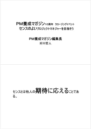 クロージングイベント センスのよいプロジェクトマネジャーを目指そう PM養成マガジン編集長 好川哲人 センスとは他人の 期待に応えることであ る。