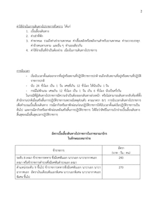 อัตราค่าเช่าทีพักในการเดินทางไปราชการในราชอาณาจักร ่ 1. กรณีเลือกเบิกในลักษณะจ่ายจริง ให้เบิกได้เท่าที่จายจริงไม่เกินอัตรา ่ ห้องพักคนเดียว ห้องพักคนคู่ ข้าราชการ (บาท : วัน : คน) (บาท : วัน : คน) ตํ า แหน่ ง ระดั บ 8 ลงมา ยศพั น เอก นาวาเอก นาวา 1,500 850 อากาศเอก ลงมา ให้เบิกค่าเช่าที่พักได้เท่าที่จ่ายจริง ไม่ เกินอัตราค่าเช่าที่พักคนเดียว ในกรณี เ ดิ น ทางไปราชการเป็ น หมู่ ค ณะ ให้ พั ก รวมกันสองคนขึ้นไปต่อหนึ่งห้อง โดยให้เบิกค่าเช่าที่พัก ได้เท่าที่จ่ายจริง ไม่เกินอัตราค่าเช่าห้องพักคู่ เว้นแต่เป็น กรณี ที่ ไ ม่ เ หมาะสมจะพั ก รวมกั น หรื อ มี เ หตุ จํ า เป็ น ที่ไม่อาจพักรวมกับผู้อื่นได้ ให้เบิกได้เท่าที่จ่ายจริงไม่เกิน อัตราค่าเช่าที่พักคนเดียว ตําแหน่งระดับ 9 หรือตําแหน่งที่เทียบเท่า ยศพันเอก 2,200 1,200 นาวาเอก นาวาอากาศเอก อัตราเงินเดือนพันเอกพิเศษ นาวาเอกพิเศษ นาวาอากาศเอกพิเศษ จะเบิกในอัตรา ค่าเช่าห้องพักคนเดียวหรือห้องพักคู่ก็ได้ ระดับ 10 ขึ้นไป ข้า ราชการซึ่ง มีย ศพลตรี พลเรื อ ตรี 2,500 1,400 พลอากาศตรี ขึ้ น ไป หรื อ ข้ า ราชการตํ า รวจซึ่ ง มี ย ศ พลตํ า รวจตรี ขึ้ น ไป จะเบิ ก ในอั ต ราค่ า เช่ า ห้ อ งพั ก คนเดียวหรือห้องพักคู่ก็ได้ ในกรณีเดินทางไปราชการเป็นหมู่คณะ และผู้ดํารง ตําแหน่งดังกล่าวข้างต้นเป็นหัวหน้าคณะ และมีความ จํ า เป็ น ต้ อ งใช้ ส ถานที่ เ ดี ย วกั น กั บ ที่ พั ก เพื่ อ เป็ น ที่ ป ระสานงานของคณะหรื อ บุ ค คลอื่ น ให้ เ บิ ก ค่ า เช่ า ที่ พั ก ได้ เ พิ่ ม ขึ้ น สํ า หรั บ ห้ อ งพั ก อี ก ห้ อ งหนึ่ ง ในอั ต รา ค่าเช่าห้องพักคนเดี ยวหรื อจะเบิกค่าเช่ าห้องชุด แทน ในอัตราไม่เกินสองเท่าของอัตราค่าเช่าห้องพักคนเดียว ก็ได้