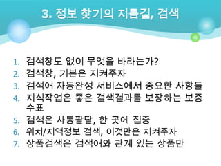 웹 기획, 사용자를 배려하는 합리적인 생각 1. 2. 검색창도 없이 무엇을 바라는가?검색창, 기본은 지켜주자검색어 자동완성 서비스에서 중요한 사항들지식작업은 좋은 검색결과를 보장하는 보증 수표검색은 사통팔달, 한 곳에 집중위치/지역정보 검색, 이것만은 지켜주자상품검색은 검색어와 관계 있는 상품만3. 정보 찾기의 지름길, 검색 3. 4. 5. 6. 7. 8. 9. 10. 11. 12. 13. 14. 15. 16. 17. 18. 19. 20. 21. 22. 23.