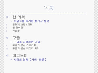 구 글 구글의분산 데이터 처리 MapReduce 분산처리를 위한 기반 기술 Sawzall 분산 처리용 프로그래밍 언어