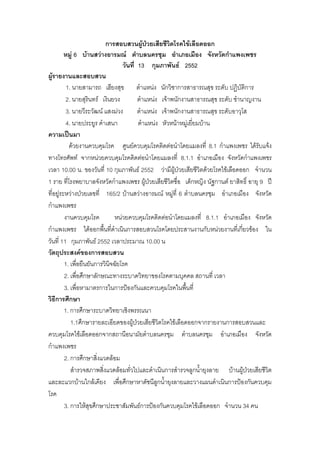 ิ หมู 6 บานสวางอารมณ ตําบลนครชุม อําเภอเมือง จังหวัดกําแพงเพชร วันที่ 13 กุมภาพันธ 2552 ผูรายงานและสอบสวน 1. นายสามารถ เฮียงสุข ตําแหนง นักวิชาการสาธารณสุข ระดับ ปฏิบัติการ 2. นายสุรินทร เงินยวง ตําแหนง เจาพนักงานสาธารณสุข ระดับ ชํานาญงาน 3. นายวีระวัฒน แสงมวง ตําแหนง เจาพนักงานสาธารณสุข ระดับอาวุโส 4. นายประยูร คําเสนา ตําแหนง หัวหนาหมูเยียมบาน ่ ความเปนมา ดวยงานควบคุมโรค ศูนยควบคุมโรคติดตอนําโดยแมลงที่ 8.1 กําแพงเพชร ไดรับแจง ทางโทรศัพท จากหนวยควบคุมโรคติดตอนําโดยแมลงที่ 8.1.1 อําเภอเมือง จังหวัดกําแพงเพชร เวลา 10.00 น. ของวันที่ 10 กุมภาพันธ 2552 วามีผปวยเสียชีวิตดวยโรคไขเลือดออก จํานวน ู 1 ราย ทีโรงพยาบาลจังหวัดกําแพงเพชร ผูปวยเสียชีวิตชื่อ เด็กหญิง นัฐกานต ยาสิทธิ์ อายุ 9 ป ่ ที่อยูระหวางปวยเลขที่ 165/2 บานสวางอารมณ หมูที่ 6 ตําบลนครชุม อําเภอเมือง จังหวัด กําแพงเพชร งานควบคุมโรค หนวยควบคุมโรคติดตอนําโดยแมลงที่ 8.1.1 อําเภอเมือง จังหวัด กําแพงเพชร ไดออกพื้นทีดําเนินการสอบสวนโรคโดยประสานงานกับหนวยงานทีเ่ กี่ยวของ ใน ่ วันที่ 11 กุมภาพันธ 2552 เวลาประมาณ 10.00 น วัตถุประสงคของการสอบสวน 1. เพื่อยืนยันการวินจฉัยโรค ิ 2. เพื่อศึกษาลักษณะทางระบาดวิทยาของโรคตามบุคคล สถานที่ เวลา 3. เพื่อหามาตรการในการปองกันและควบคุมโรคในพืนที่ ้ วิธีการศึกษา 1. การศึกษาระบาดวิทยาเชิงพรรณนา 1.1ศึกษารายละเอียดของผูปวยเสียชีวิตโรคไขเลือดออกจากรายงานการสอบสวนและ ควบคุมโรคไขเลือดออกจากสถานีอนามัยตําบลนครชุม ตําบลนครชุม อําเภอเมือง จังหวัด กําแพงเพชร 2. การศึกษาสิงแวดลอม ่ สํารวจสภาพสิงแวดลอมทั่วไปและดําเนินการสํารวจลูกน้ํายุงลาย บานผูปวยเสียชีวิต ่ และละแวกบานใกลเคียง เพื่อศึกษาหาดัชนีลูกน้ํายุงลายและวางแผนดําเนินการปองกันควบคุม โรค 3. การใหสุขศึกษาประชาสัมพันธการปองกันควบคุมโรคไขเลือดออก จํานวน 34 คน