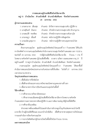 ิ หมู 10 บานโละโคะ ตําบลโกสัมพี อําเภอโกสัมพีนคร จังหวัดกําแพงเพชร 28 มกราคม 2552 ผูรายงานและสอบสวน 1. นายสามารถ เฮียงสุข ตําแหนง นักวิชาการสาธารณสุข ระดับ ปฏิบัติการ 2. นายสุรินทร เงินยวง ตําแหนง เจาพนักงานสาธารณสุข ระดับ ชํานาญงาน 3. นายสมบัติ ทองชอย ตําแหนง เจาพนักงานสาธารณสุข ระดับอาวุโส 4. นายเจษฎา เอี่ยมดี ตําแหนง พนักงานปฏิบัติการชันสูตรโรค 5. นายมนัส มุงขุนการ ตําแหนง พนักงานปฏิบัติการควบคุมพาหะนําโรค ความเปนมา ดวยงานควบคุมโรค ศูนยควบคุมโรคติดตอนําโดยแมลงที่ 8.1 กําแพงเพชร ไดรับแจง ทางโทรศัพท จากงานควบคุมโรคติดตอ สํานักงานสาธารณสุข จังหวัดกําแพงเพชร เวลา 10.00 น. ของวันที่ 25 มกราคม 2552 วามีผปวยเสียชีวิตดวยโรคไขมาลาเรีย จํานวน 1 ราย ที่ ู โรงพยาบาลจังหวัดกําแพงเพชร ผูปวยเสียชีวิตชื่อ นางสาว นภิสรา ธนดลบรรพต อายุ 37 ป อยูบานเลขที่ 12 หมู10 บานโละโคะ ตําบลโกสัมพี อําเภอโกสัมพีนคร จังหวัดกําแพงเพชร งานควบคุมโรค ศูนยควบคุมโรคติดตอนําโดยแมลงที่ 8.1 กําแพงเพชร ไดออกพืนที่ ้ ดําเนินการสอบสวนโรคโดยประสานงานกับหนวยงานทีเ่ กี่ยวของ ในวันที่ 27 มกราคม 2552 เวลาประมาณ 06.00 น วัตถุประสงคของการสอบสวน 1. เพื่อยืนยันการวินจฉัยโรค ิ 2. เพื่อศึกษาลักษณะทางระบาดวิทยาของโรคตามบุคคล สถานที่ เวลา 3. เพื่อหามาตรการในการปองกันและควบคุมโรคในพืนที่ ้ วิธีการศึกษา 1. การศึกษาระบาดวิทยาเชิงพรรณนา 1.1ศึกษารายละเอียดของผูปวยเสียชีวิตโรคไขมาลาเรียจากโรงพยาบาลจังหวัด กําแพงเพชรจากผลการตรวจทางหองปฏิบัติการ และการสัมภาษณญาติผูปวยที่เสียชีวิต 2. การศึกษาสิงแวดลอม ่ สํารวจสภาพสิงแวดลอมทั่วไปและดําเนินการสํารวจลูกน้ํายุงกนปลองพาหะนําโรคไข ่ มาลาเรีย บานผูปวยเสียชีวตและ ละแวกบานใกลเคียง เพื่อศึกษาหาสาเหตุของการเกิดโรคและ ิ วางแผนดําเนินการปองกันควบคุมโรค 3. การเจาะโลหิตคนหาผูปวยรายใหมในพืนที่เกิดโรค จํานวน 134 คน ้ ผลการสอบสวนโรค