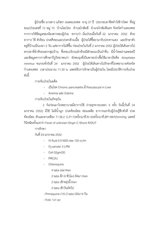 ธนดลบรรพต อายุ 37 ป ประกอบอาชีพทําไรขาวโพด ที่อยู ขณะปวยเลขที่ 12 หมู 10 บานโละโคะ ตําบลโกสัมพี อําเภอโกสัมพีนคร จังหวัดกําแพงเพชร จากการใหขอมูลของนองสาวของผูปวย ทราบวา เริ่มปวยเมื่อวันที่ 22 มกราคม 2552 ดวย อาการ ไข ตัวรอน ปวดศีรษะและปวดกลามเนื้อ ผูปวยไดซื้อยามารับประทานเอง และรักษาตัว อยูที่บานเปนเวลา 2 วัน แตอาการไมดีขึ้น กอนปวยในวันที่ 2 มกราคม 2552 ผูปวยไดเดินทางไป ตกปลาที่ลาหวยนอกกลุมบาน ซึงรอบบริเวณลําหวยมีลักษณะเปนปาทึบ มีนาไหลผานตลอดป ํ ่ ้ํ และขอมูลจากการศึกษากีฎวิทยาพบวา ยังพบยุงที่เปนพาหะนําเชือไขมาลาเรียคือ Anopheles ้ minimus จนกระทังวันที่ 24 มกราคม 2552 ผูปวยไดเดินทางไปรักษาที่โรงพยาบาลจังหวัด ่ กําแพงเพชร เวลาประมาณ 11.30 น. แพทยรับการรักษาเปนผูปวยใน โดยมีประวัติการเจ็บปวย ดังนี้ การเจ็บปวยในอดีต - เปนโรค Chronic pancreatitis มี Pseudocyst in Liver - Anemia และ Edema การเจ็บปวยในปจจุบัน 2 วันกอนมาโรงพยาบาลมีอาการไข ถายอุจจาระเหลว 3 ครั้ง วันนี้(วันที่ 24 มกราคม 2552) มีไข ไมมีน้ํามูก ปวดทองนอย ออนเพลีย อาการแรกรับผูปวยรูสึกตัวดี ปวด ทองนอย ตัวและตาเหลือง T=36.2 C,P=72ครั้ง/นาที,R=20ครั้ง/นาที,BP=88/55mm/Hg แพทย วินิจฉัยครั้งแรกวา Fever of unknown Origin C Shock R/OUT การรักษา วันที่ 24 มกราคม 2552 - IV fluid 0.9 NSS rate 120 cc/hr - O2canular 3 LPM - Cef-32gmOD - PRC2U - Chloroquine 4 tabs stat then 2 tabs อีก 6 ชั่วโมง ถัดมา then 2 tabs เชาพรุงนี้ then 2 tabs เชาวันถัดไป - Primaquine (15) 2 tabs ODx14 วัน - Folic 1x1 pc