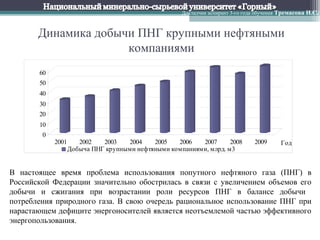 Доклад аспиранта Тремасовой И.С. посвящен проблемам использования попутного нефтяного газа (ПНГ) в России, где акцентируется внимание на росте объемов его добычи и сжигания. В документе отмечается, что ПНГ является ценным сырьем для нефтехимии и его рациональное использование имеет ключевое значение в условиях дефицита энергоносителей. Указывается, что ежегодно сжигается от 17 до 25 млрд. м³ ПНГ, что приводит к значительным загрязнениям атмосферы.