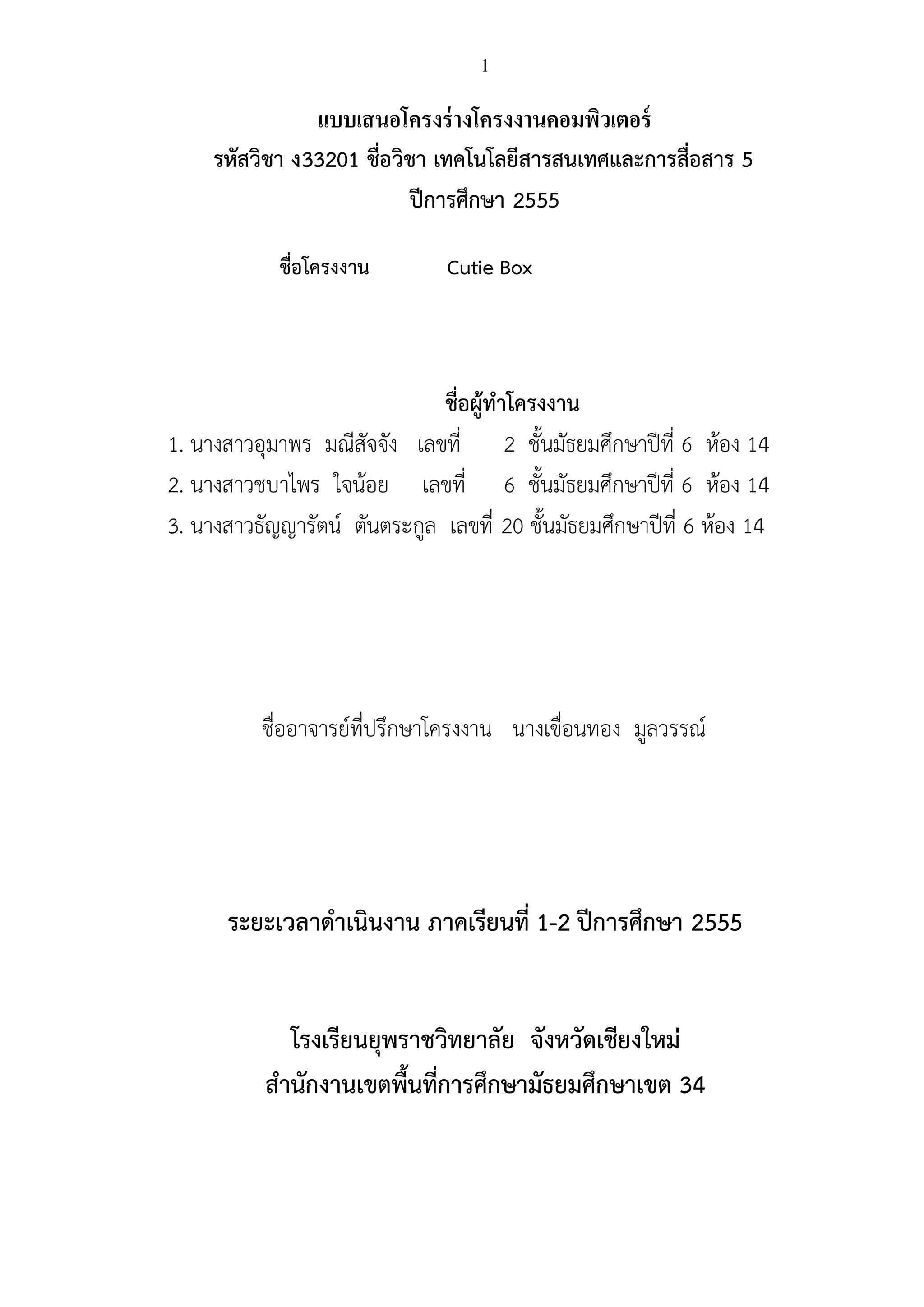 เทคโนโลยีสารสนเทศและการสื่อสาร 5 ปีการศึกษา 2555 ชื่อโครงงาน Cutie Box ชื่อผู้ทาโครงงาน 1. นางสาวอุมาพร มณีสัจจัง เลขที่ 2 ชั้นมัธยมศึกษาปีที่ 6 ห้อง 14 2. นางสาวชบาไพร ใจน้อย เลขที่ 6 ชั้นมัธยมศึกษาปีที่ 6 ห้อง 14 3. นางสาวธัญญารัตน์ ตันตระกูล เลขที่ 20 ชั้นมัธยมศึกษาปีที่ 6 ห้อง 14 ชื่ออาจารย์ที่ปรึกษาโครงงาน นางเขื่อนทอง มูลวรรณ์ ระยะเวลาดาเนินงาน ภาคเรียนที่ 1-2 ปีการศึกษา 2555 โรงเรียนยุพราชวิทยาลัย จังหวัดเชียงใหม่ สานักงานเขตพื้นที่การศึกษามัธยมศึกษาเขต 34