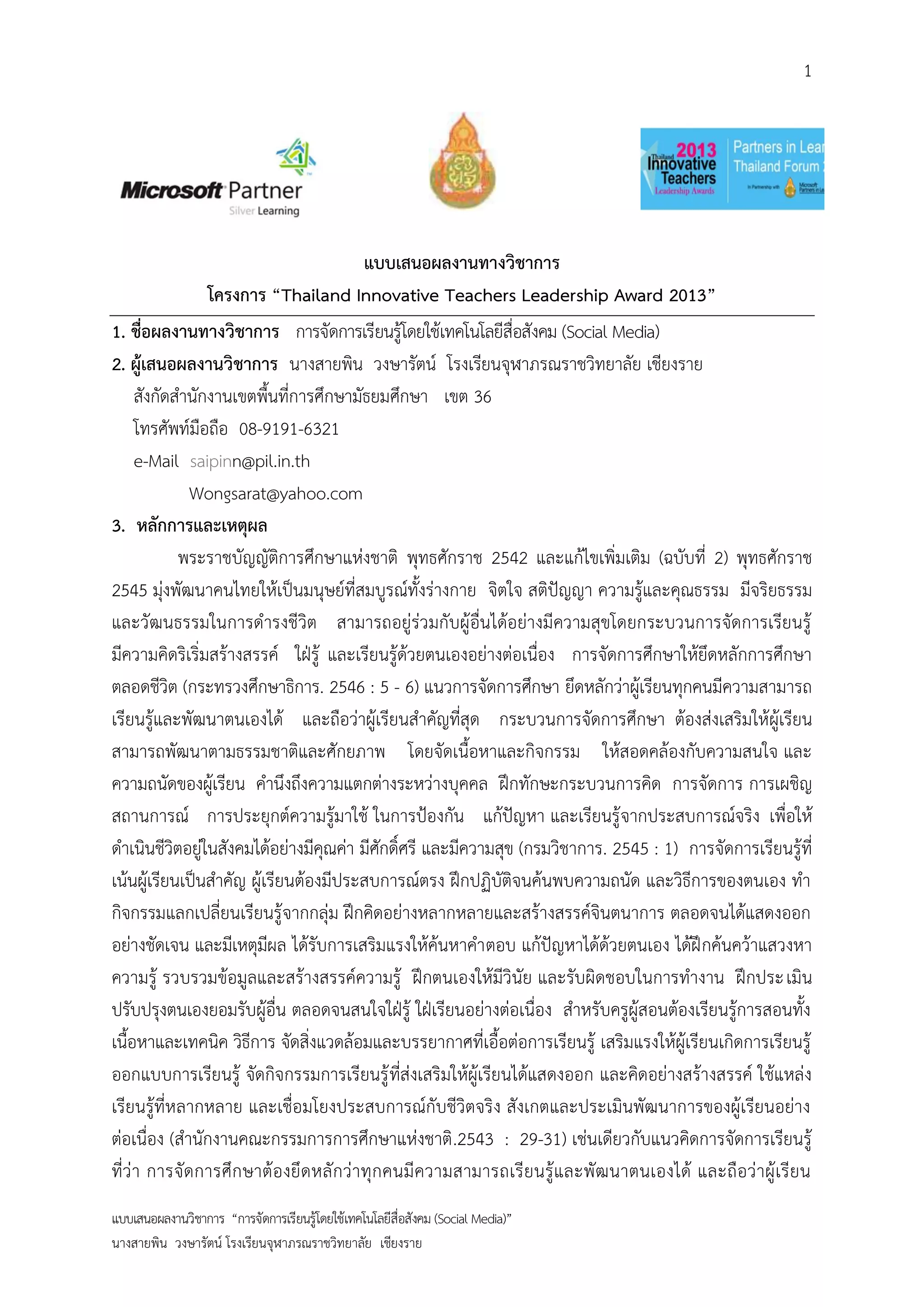 ข้าพเจ้าขอส่งผลงานเข้าร่วมโครงการ “Thailand Innovative Teachers Leadership Award 2013” ประกอบด้วยแบบเสนอผลงาน(เอกสารฉบับนี้ หลักฐานประกอบผลงาน (รูปเล่มจานวน 2 ชุด และบันทึกใน CD-ROM จานวน 2 ชุด) หลักฐานประกอบผลงานนักเรียน (บันทึกใน CD-ROM จานวน 2 ชุดๆละ 6 รายการ) อื่นๆ สาเนาเกียรติบัตร ลงชื่อ. ผู้รายงาน (นางสายพิน วงษารัตน์) ครู วิทยฐานะชานาญการพิเศษ วันที่ 8 กุมภาพันธ์ พ.ศ. 2556 แบบเสนอผลงานวิชาการ “การจัดการเรียนรู้โดยใช้เทคโนโลยีสื่อสังคม (Social Media)” นางสายพิน วงษารัตน์ โรงเรียนจุฬาภรณราชวิทยาลัย เชียงราย