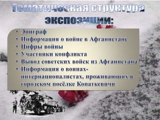 Документ описывает участие белорусских солдат в афганской войне, включая цифры потерь и личные истории военнослужащих из посёлка Копаткевичи. Главное внимание уделяется патриотическому воспитанию молодёжи и сохранению памяти о ветеранах войны. Приводятся биографии участников, включая их службу и награды за мужество.